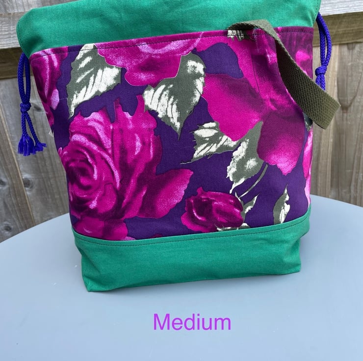 Drawstring project bag for knitting, crochet or embroidery - pinky purply roses