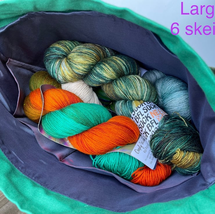 The large comfortably holds 6 skeins of 4plyfingering weight yarn, the medium holds 4 and the small holds 2. I would say the large is good for sweater projects or shlankets, the medium for cropped sweaters or average size shawls and the small suits socks or hats.