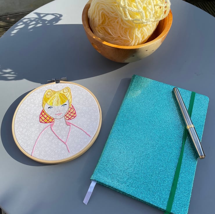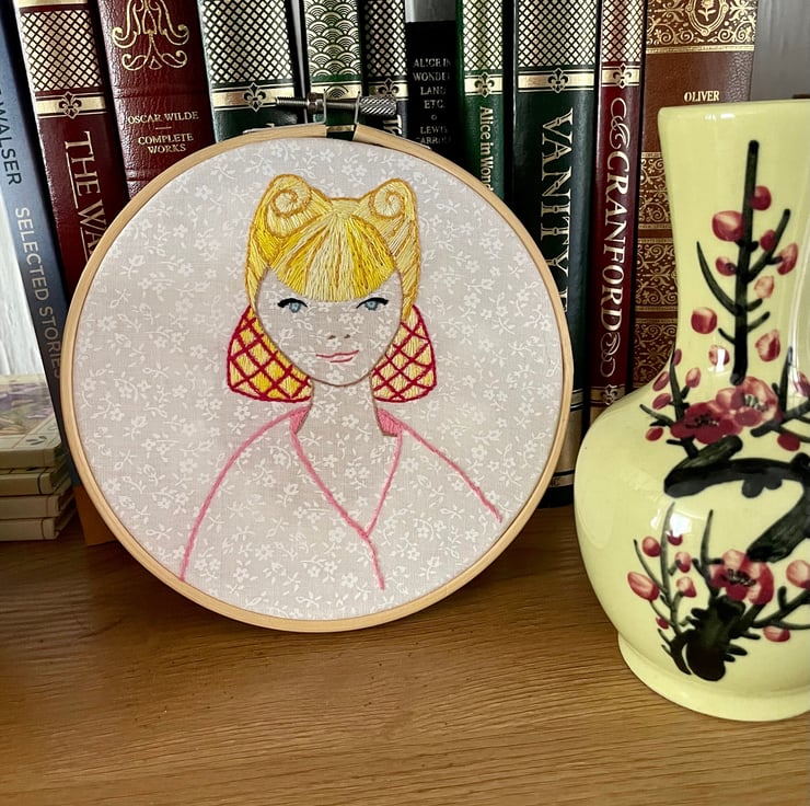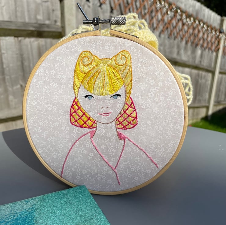 The girl's hair is a blend of colours so that as you move past the embroidery, you'll see a subtle change in her hair colour, depending on which angle you look at it. It's a nice effect if I do say so myself!