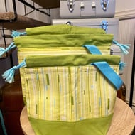 I find I love making project bags, and I love to use remaindered or destash fabrics to create very small amounts of each colourway. I like that the randomness of finding a small amount of lovely fabric and then finding something from my own stash to go with it very enjoyable. Sometimes you have to be quite creative in your thinking or hold on to a fabric for a long time until its perfect partner appears.