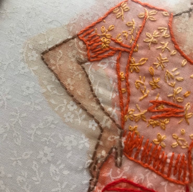 I love vintage fashion illustration and have often thought how well they would translate to embroidery with their clearly defined lines. So taking inspiration from a vintage underwear knitting pattern (yes really) I drew this onto a piece of pretty printed fabric and then coloured that in with watercolours. I really wanted a slightly smudgy look as if you were looking at something old perhaps through a lens. I was also keen to add colour without using very heavy embriodery so I knew watercolours would give me the flexibility of adding washes of different colours and tones without losing any fine detail with stitching.