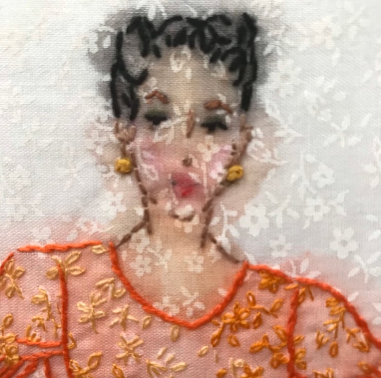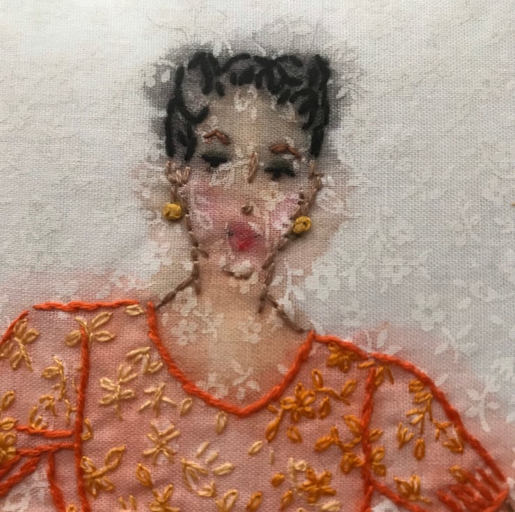 Vintage themed original embroidery art showing a dark haired woman painted with watercolours onto white fabric printed with a white floral design and then hand embroidered. This is an original design that will always be unique because it cannot be exactly reproduced.
