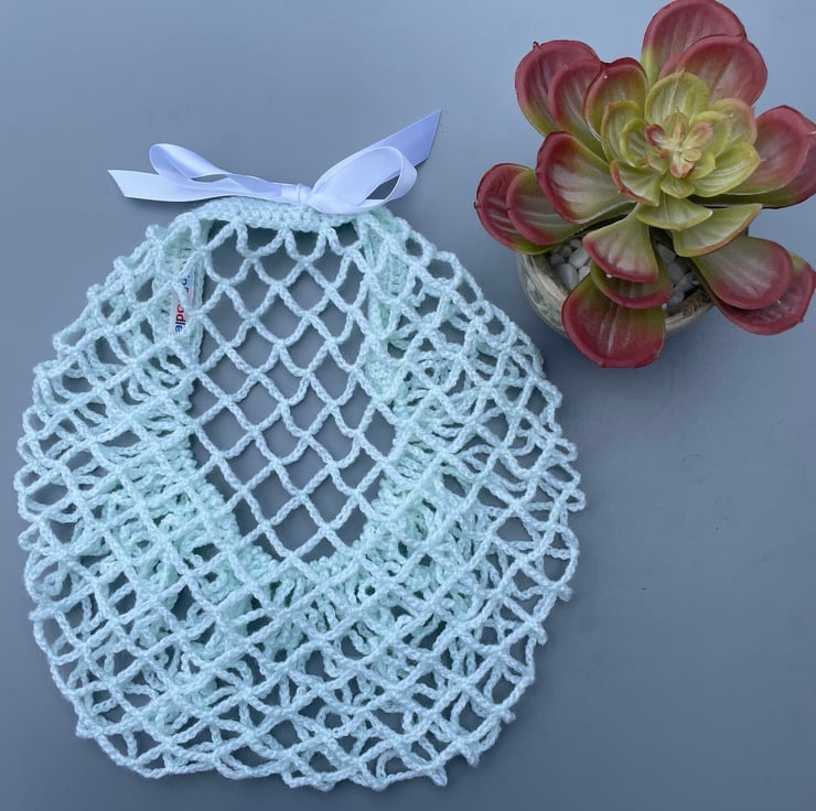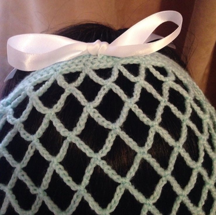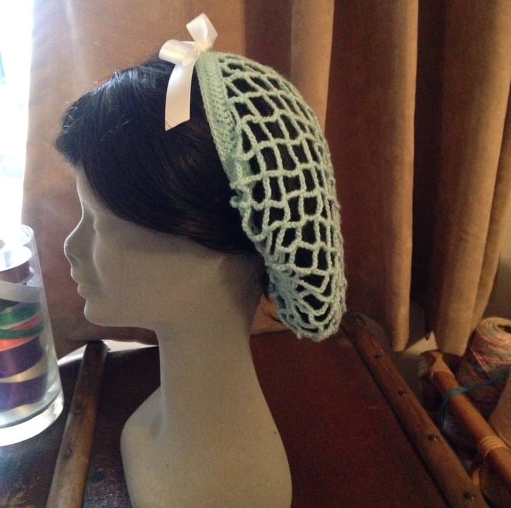 This snood is a lovely mint green set off with a white satin ribbon bow. It has an elasticated back to give a comfortable and secure fit.