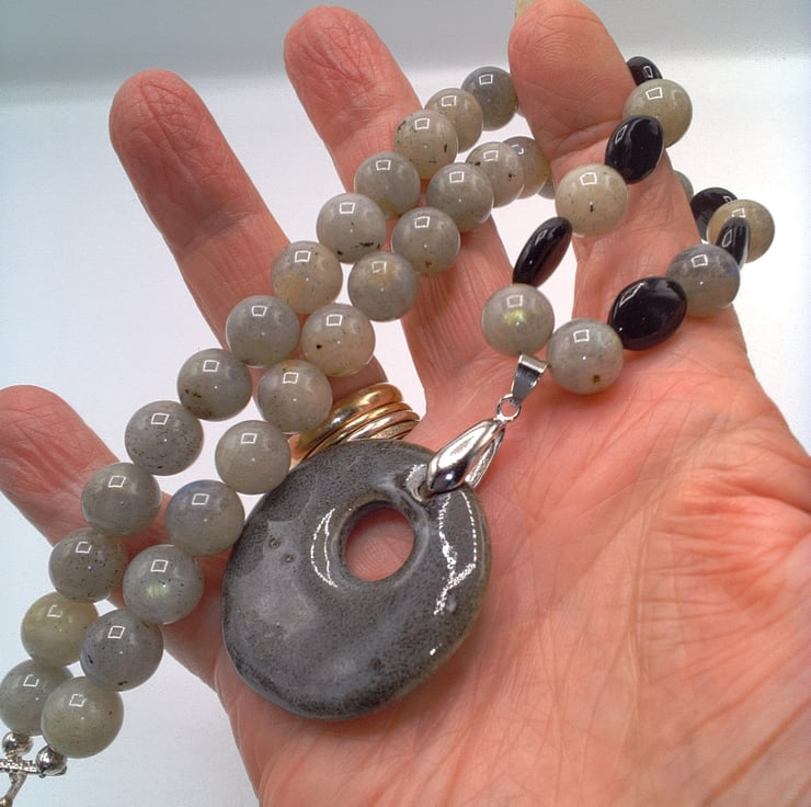 This stunning necklace will put the finishing touches to any outfit you wear everyday or for a casual evening get together. It would also make a lovely gift for a friend or relative for a birthday, anniversary or a lovely treat for yourself. The round charcoal grey agate donut pendant measures 35 mm in diameter. It is suspended by a silver plated bail on a necklace made with 10 mm grey speckled agate bead and 10 x 8 mm black oval glass beads and fastened with a silver plated toggle clasp. It measures 17.5 inches (44.5 cm) in length. The necklace will be dispatched wrapped in tissue paper in an organza bag and delivered to you via Royal Mail first class post.