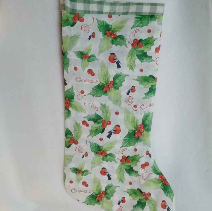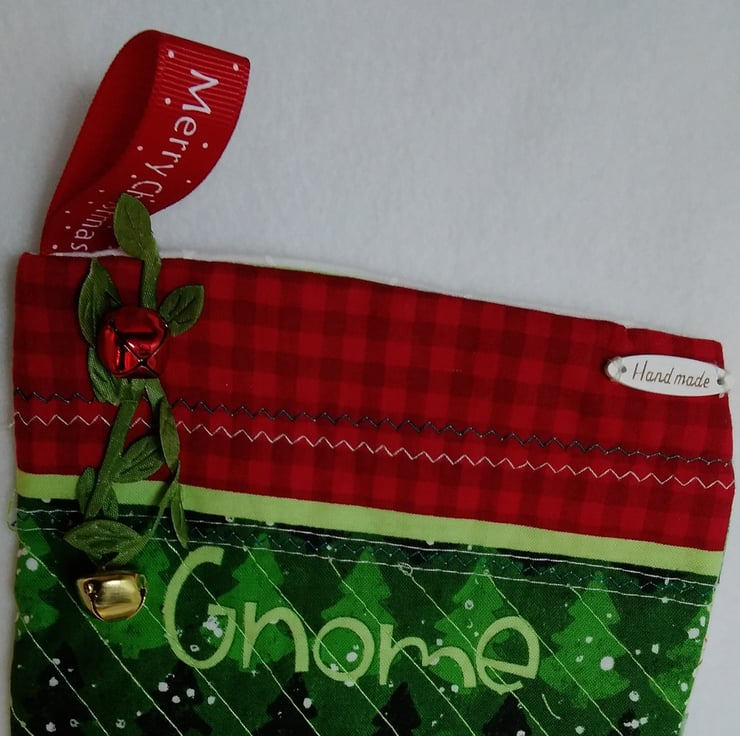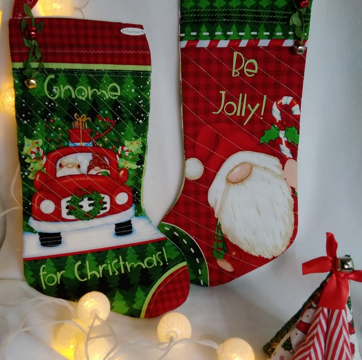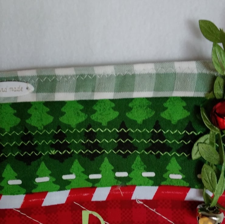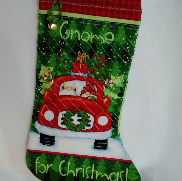 A Christmas stocking with a country theme showing santa driving his little red car in the forest. The colours are warm and rustic plaid gives this stocking a cosy feel.