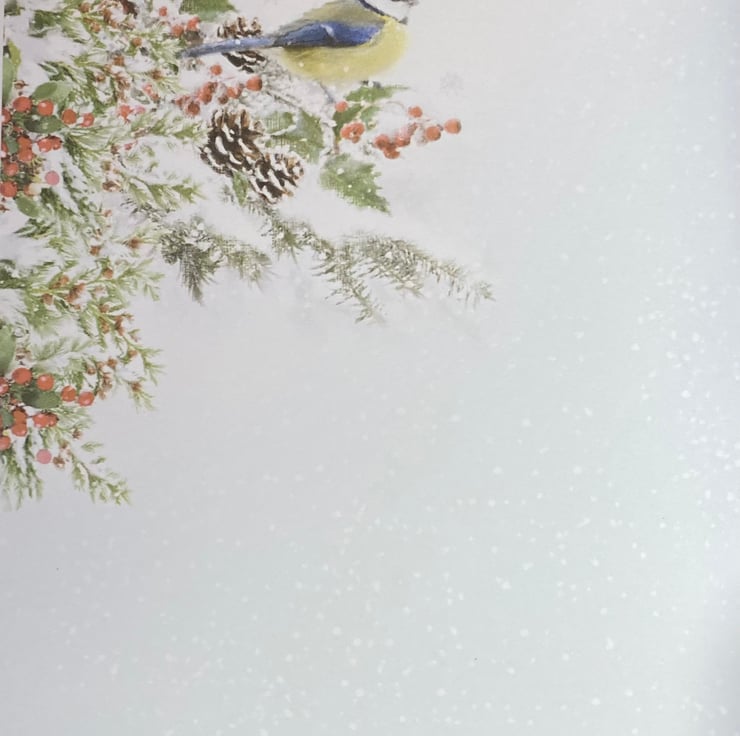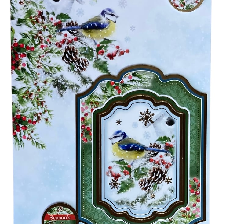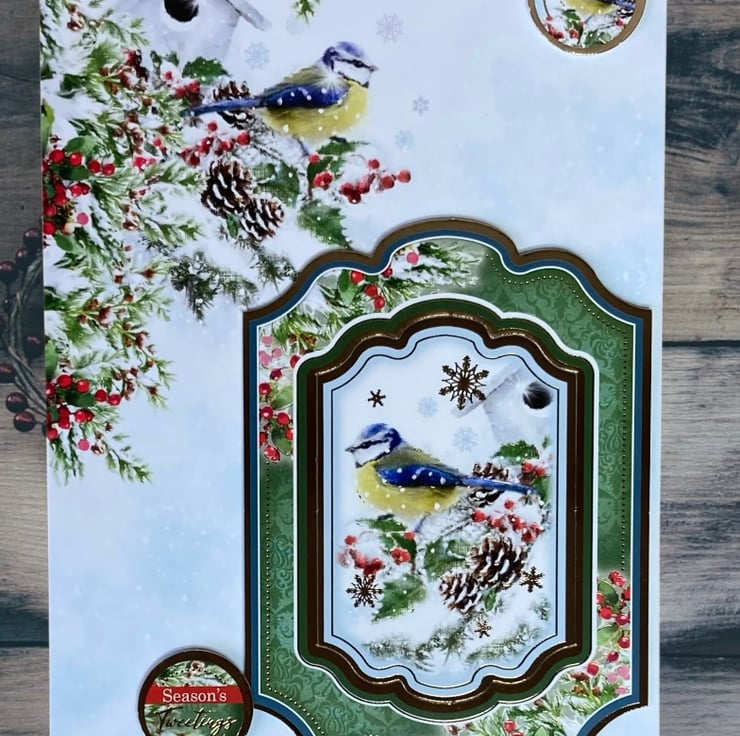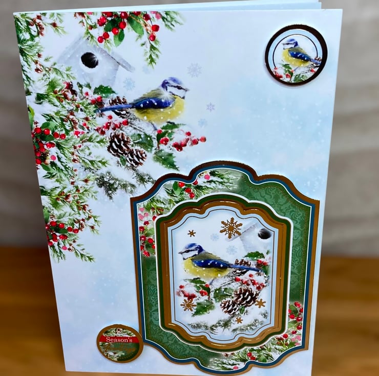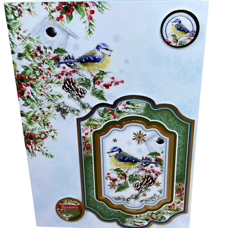 This luxury card features a white base overlaid with gold foiled quality card. A large topper with a Blue Tit, and the words Seasons Tweetings have been added in 3D.