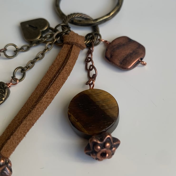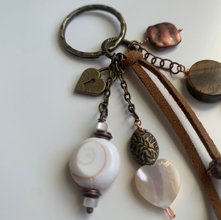 Pretty bag charm in earthy tones. This piece uses bronze and copper coloured metals and has a beautiful shell bead, a mother of pearl heart and a piece of tigers eye disc. Finished with faux leather and some ornamental copper findings. It has a bronze tone key ring for attaching to what ever you choose