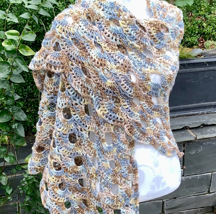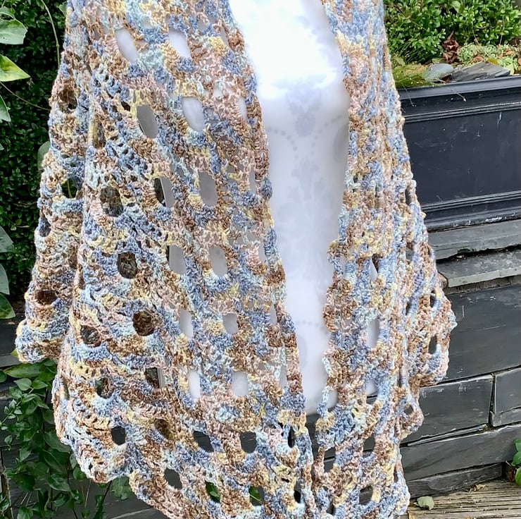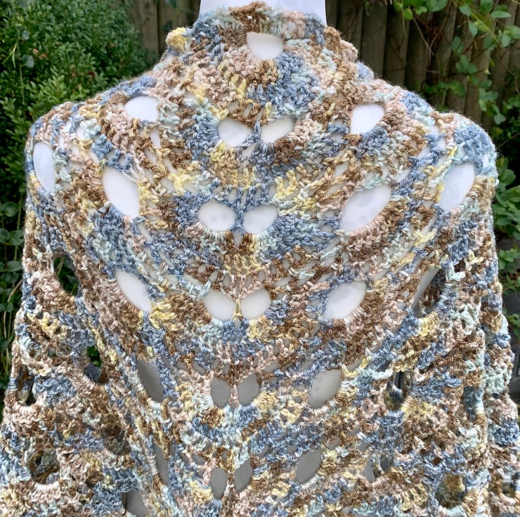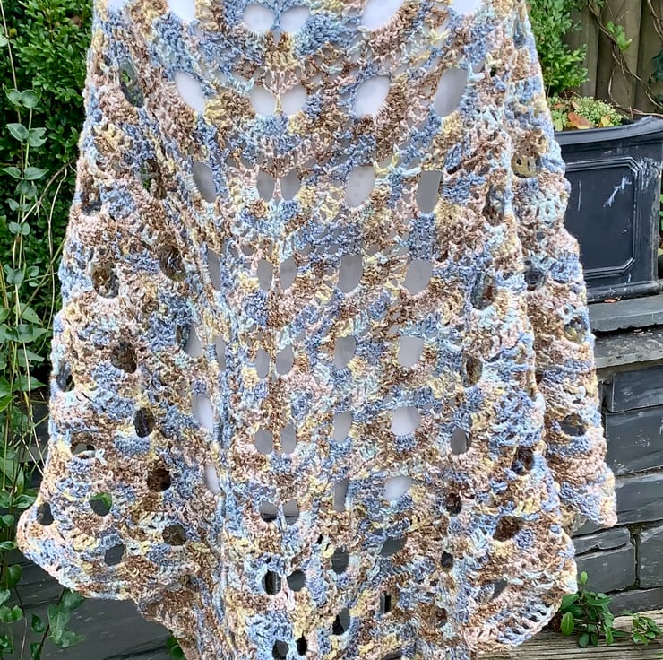 Handmade large shawl crocheted in "virus” design, created using James C Brett stonewash yarn in multiple shades of beige, browns with yellows and blues. Straight line upper edge with scalloped lower edge. Warm yet lightweight at 400g. Overall size is 210cm wingspan and 105cm length. All my products are made in a smoke and pet free home too. Hand wash or machine wool setting, dry flat and don’t iron.