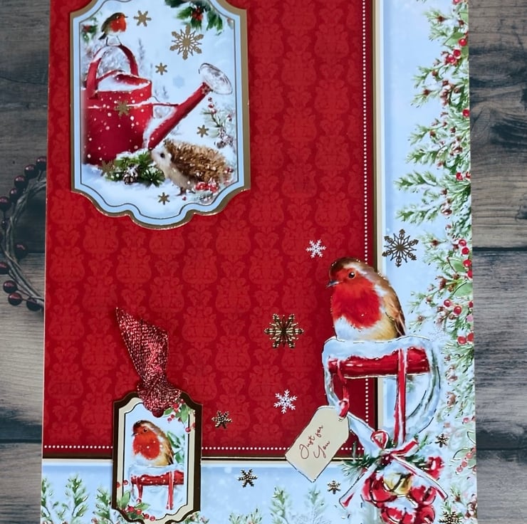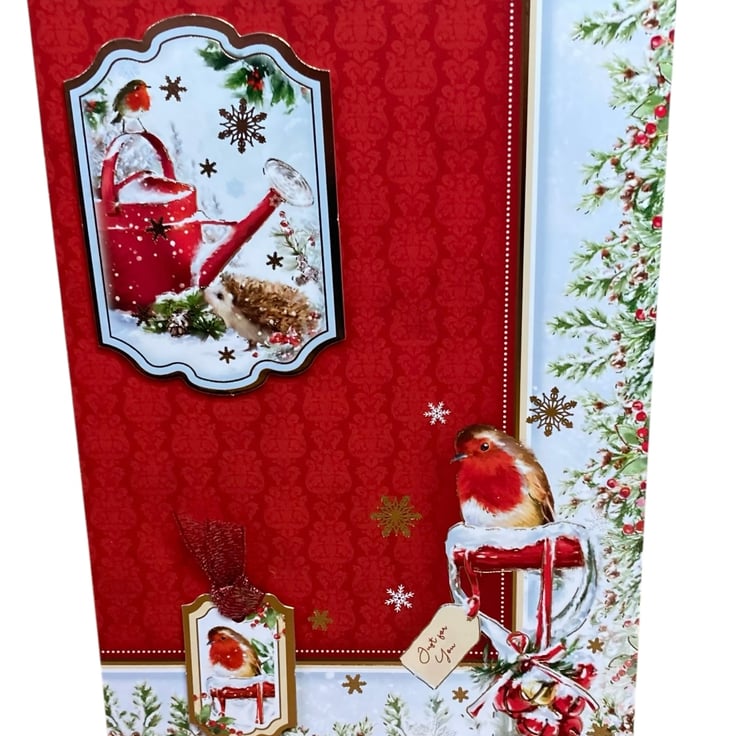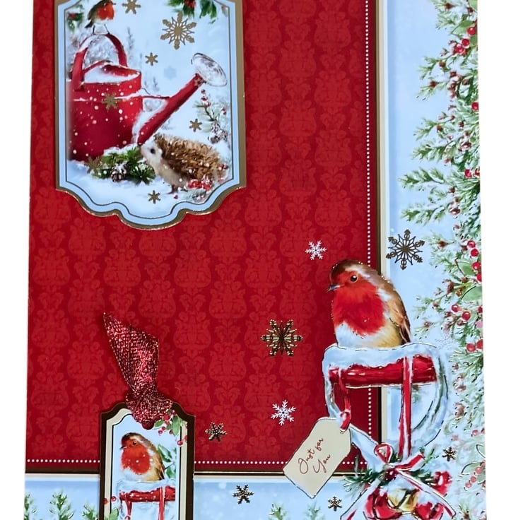 This luxury card features a white base overlaid with gold foiled quality card. Large toppers with a robin and hedgehog have been added in 3D. The sentiment just for you appears on a little tag.