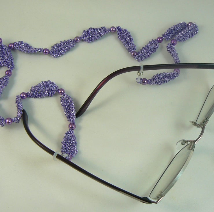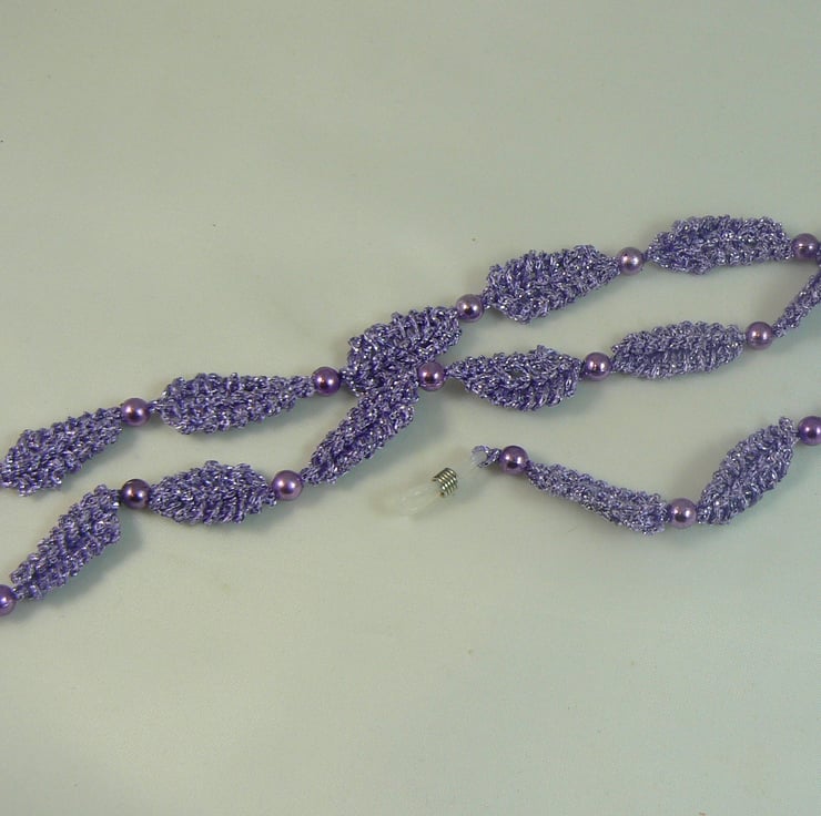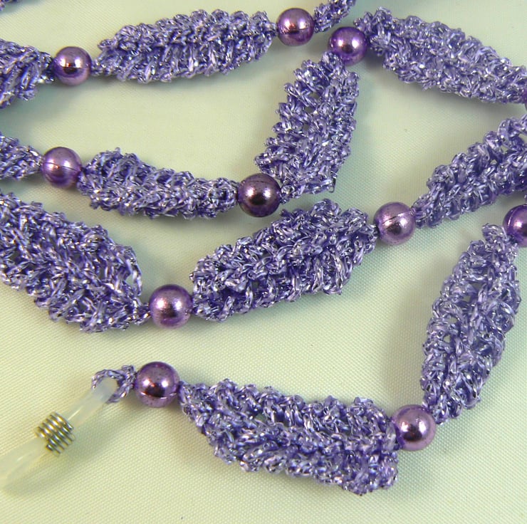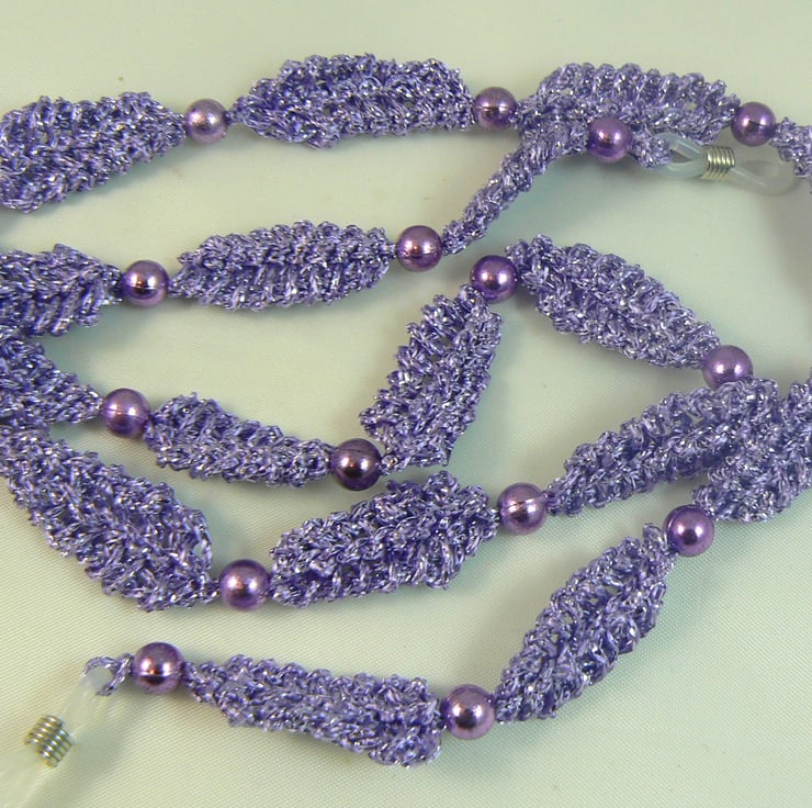 I have crocheted this glasses lanyard chain in a leaf design in a sparkly lilac thread , with lilac metallic beads separating the leaves.
