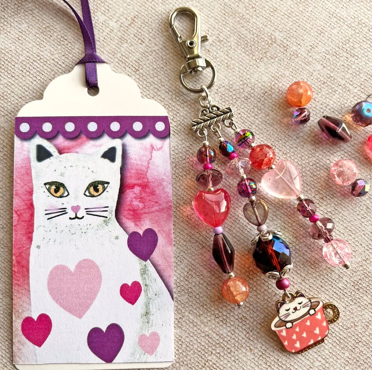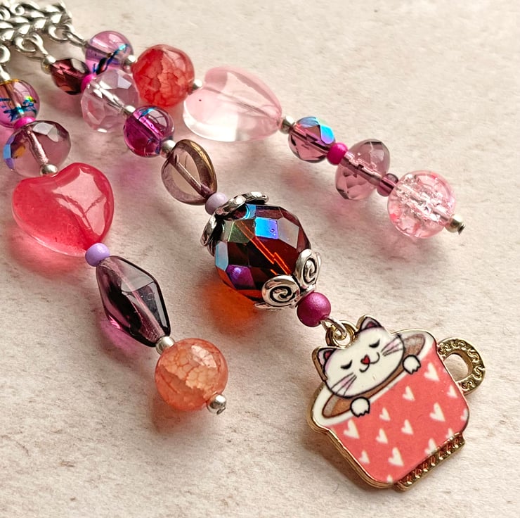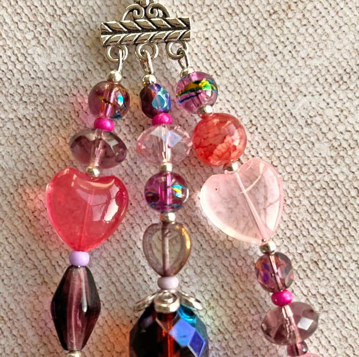 I've used a cute enamel charm and an assortment of glass beads in shades of pink and purple with a large Czech fire-polished feature bead.