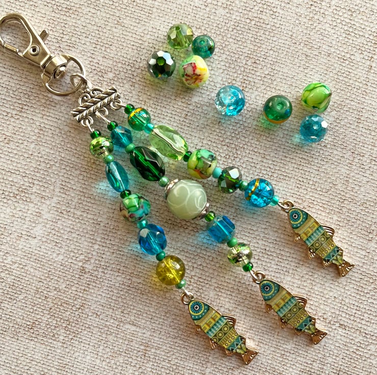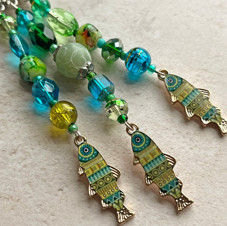 Three colourful enamel fish charms are swimming in a selection of glass beads in shades of green and teal. The beads include crackle glass, drawbench and a pale green Jade bead. I've also used a selection of seed beads to act as spacers.