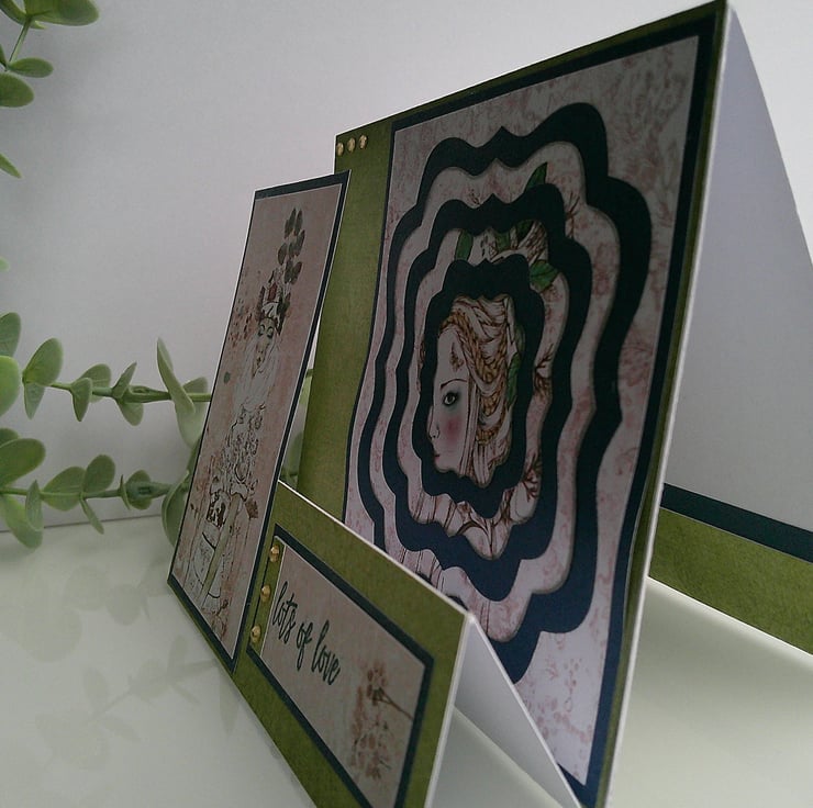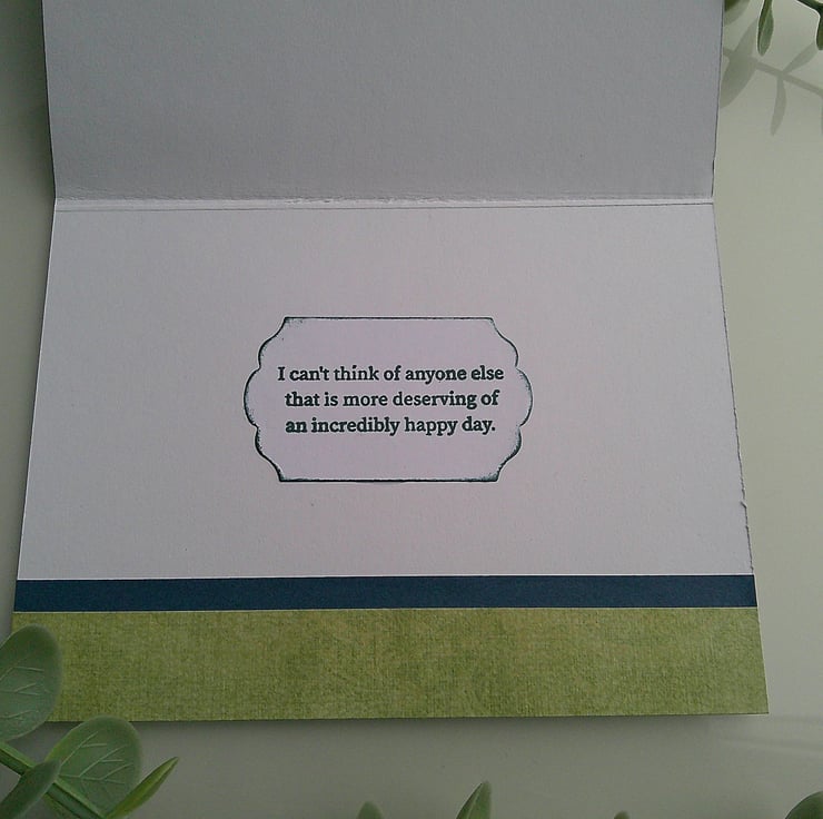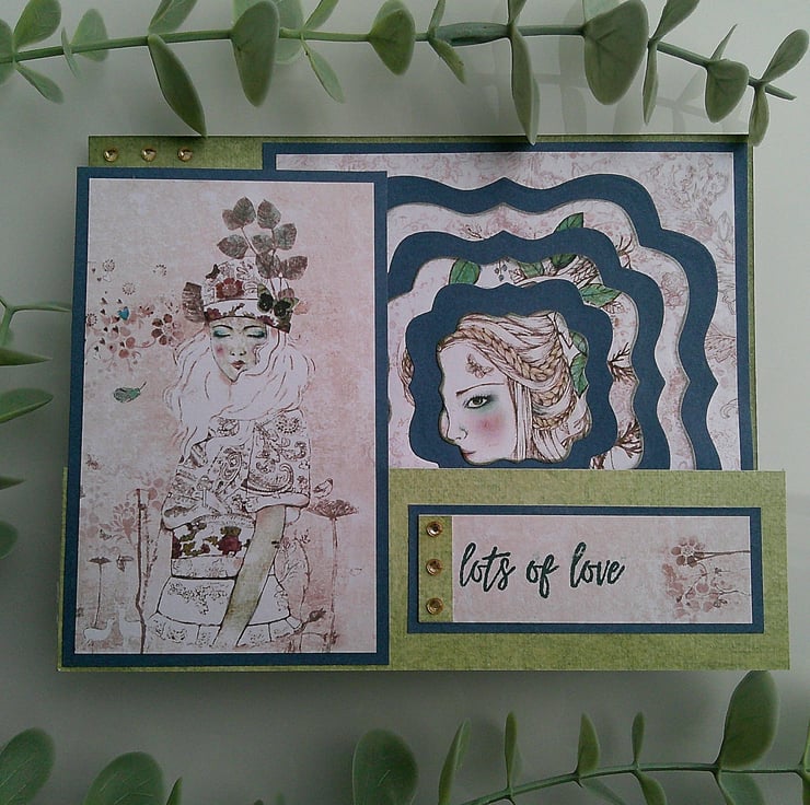Stepper card featuring bohemian / ethereal images in a navy blue and soft green colour palette, with a front sentiment reading 'Lots of Love' and an internal sentiment reading 'I can't think of anyone else that is more deserving of an incredibly happy day.