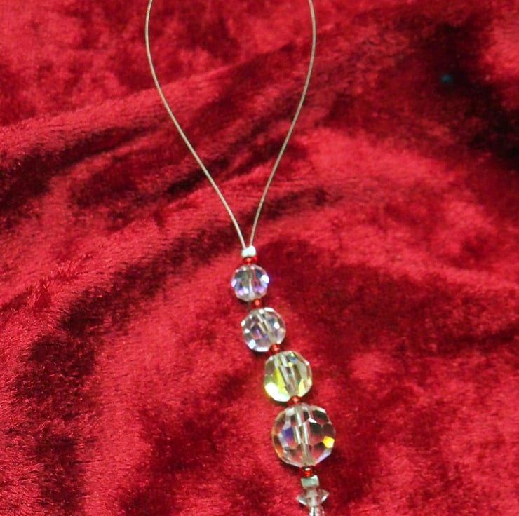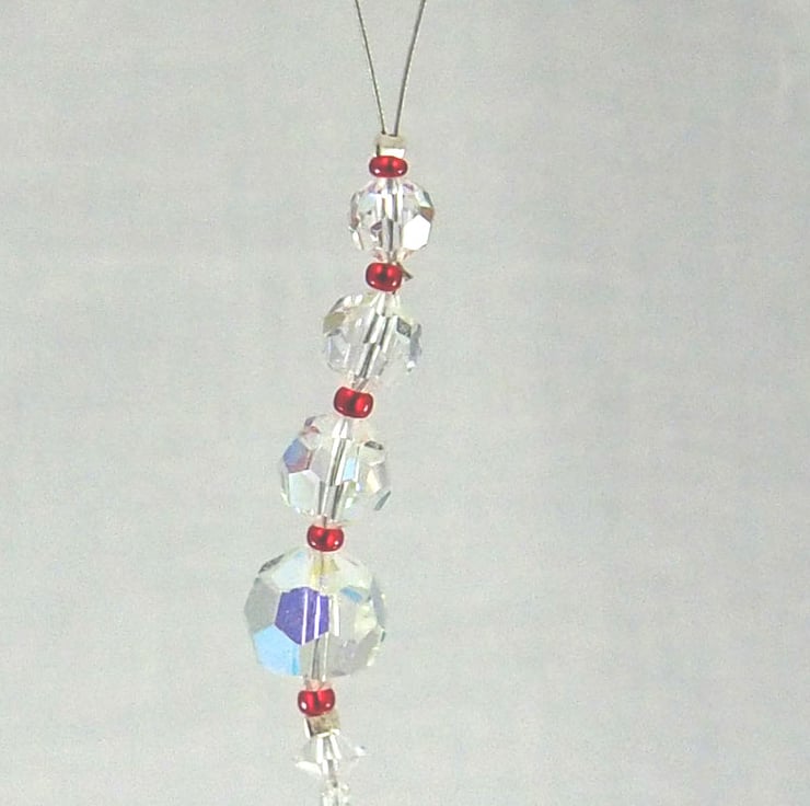 These beads have a slight rainbow shimmer and are highly faceted for extra sparkle. Starting with a large one at the bottom and going up to a little one at the top each crystal bead has a tiny, clear red, seed bead in between it and the next.