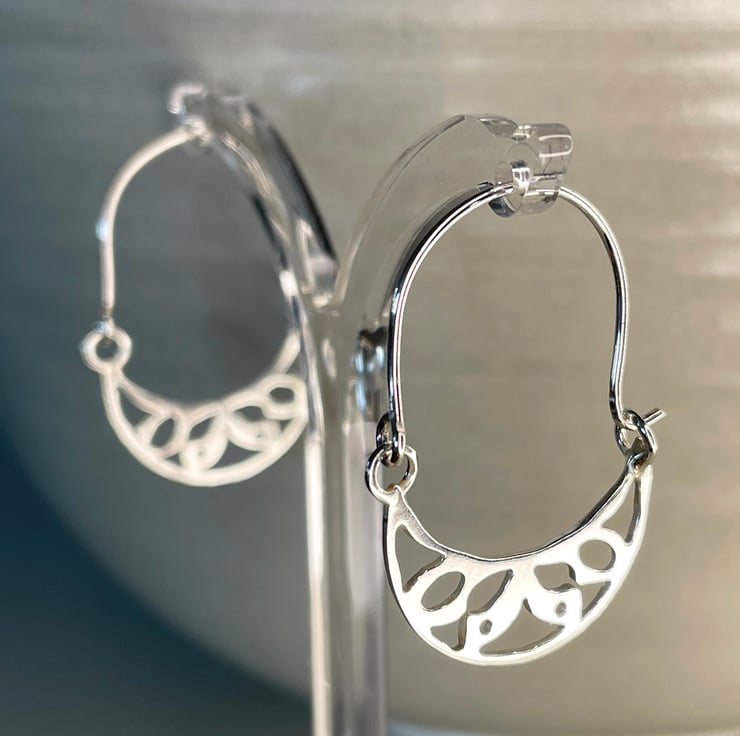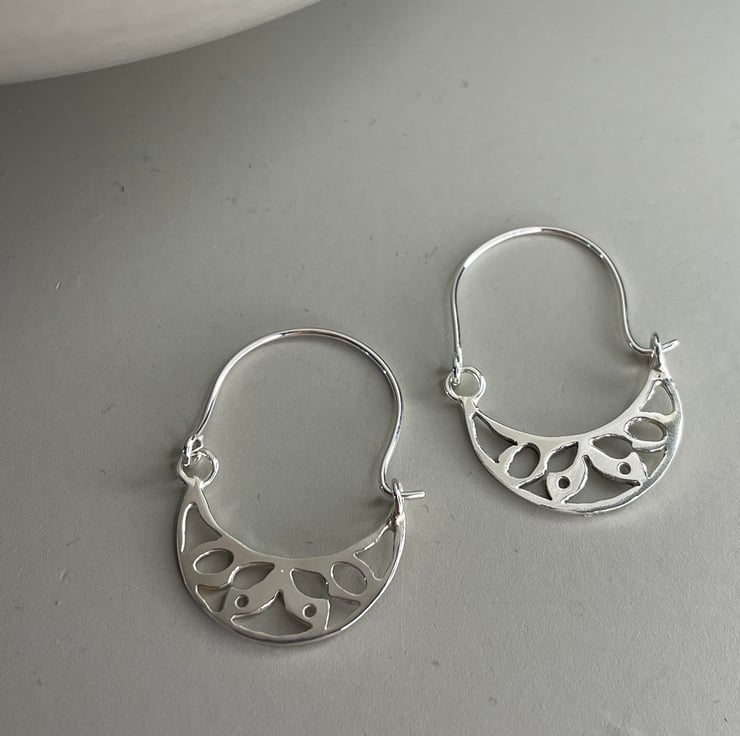 With a hint of Aztec designs, these crescent earrings are a contemporary twist on the traditional hoop style. Flat semi circles with decorative pattern are hung from long ear wires gives the earrings a fresh mood and lots of movement. Made from recycled Sterling silver they are 30mm in length.
