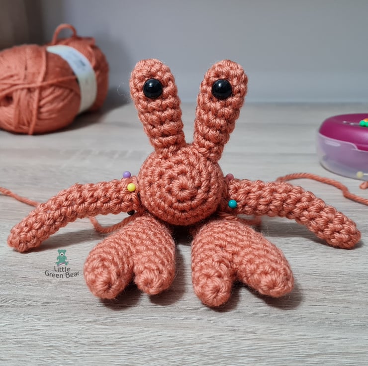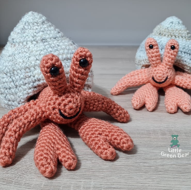 I’ve made Horace the hermit crab using Aran/worsted weight yarn. I used a tweed yarn for the shell, but you can use any tweed mix/variegated/print yarn to give it a lovely “shell” look. He is 6.5 inches long and the shell is 5 inches tall (when made with the recommended materials).