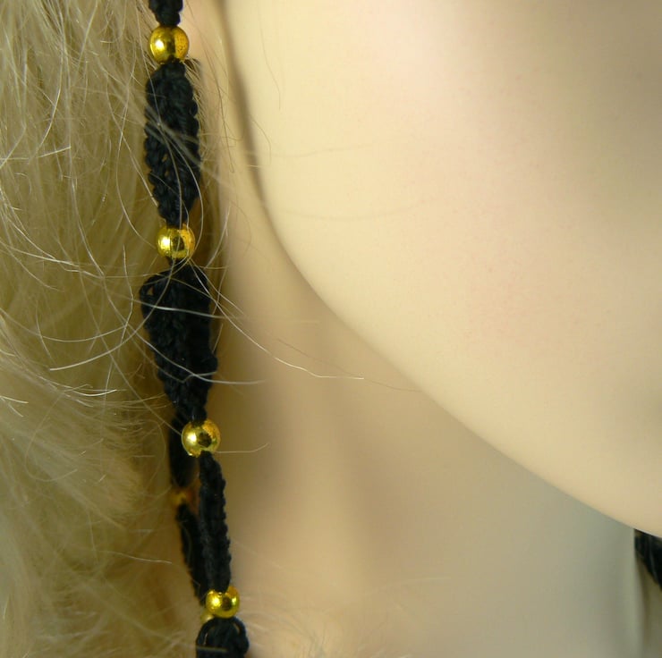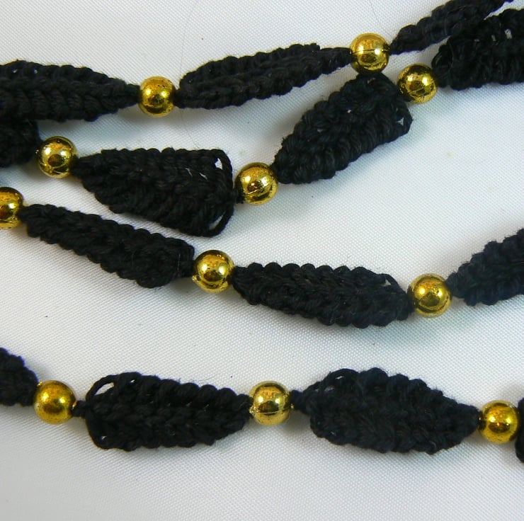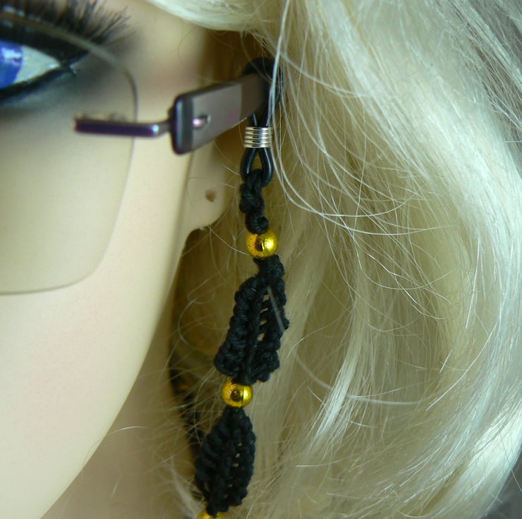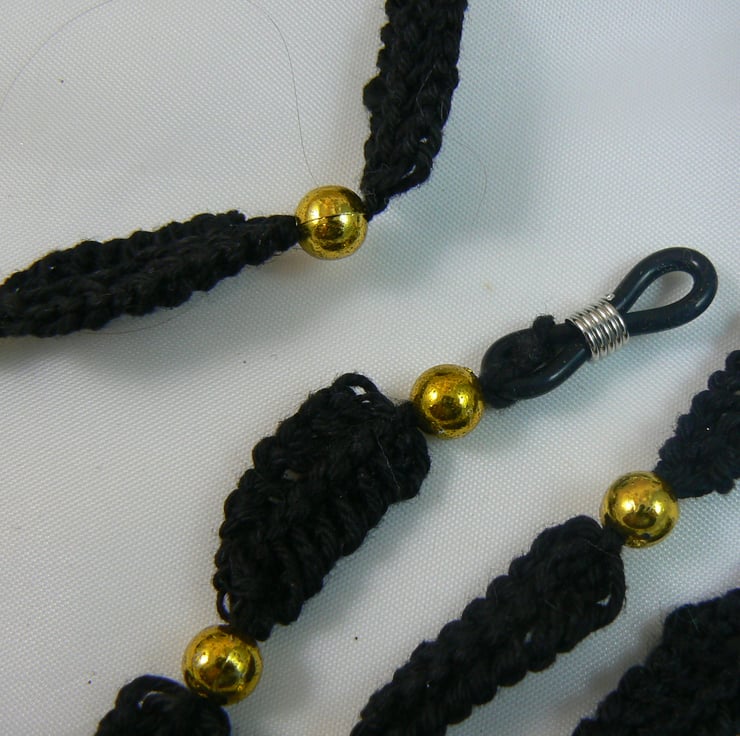 A very useful accessory to have, saves putting reading glasses down and forgetting where you have put them. Just pop the lanyard onto the glasses and they will always be at hand, hanging round your neck. I have crocheted this black lanyard in a leaf pattern and the leaves are separated by metallic gold beads.
