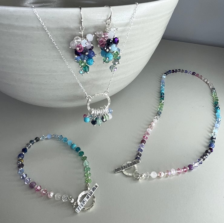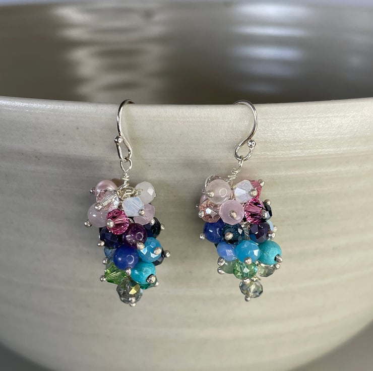 Stunning rainbow cluster beaded earrings are the perfect addition to your earring collection with an array of brightly coloured faceted crystal, glass pearl and semi precious beads. The beads are gathered individually on fine recycled Sterling silver pins, in a rainbow of colours with different transparent, semi opaque and solid finishes. The earrings measure 35mm - 1.5" long from the top of the ear wire to the end hanging bead. These earrings can be made in different colourways - please message for more info.