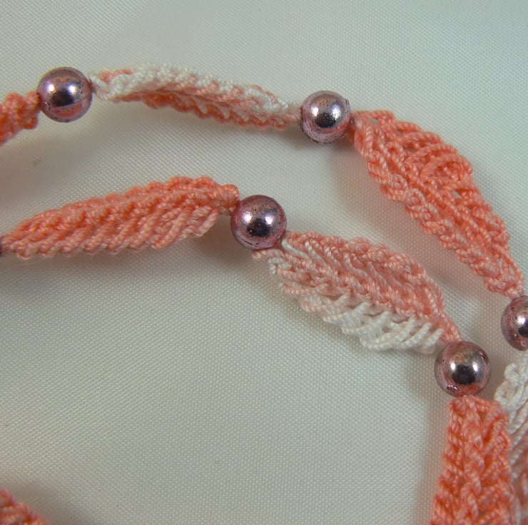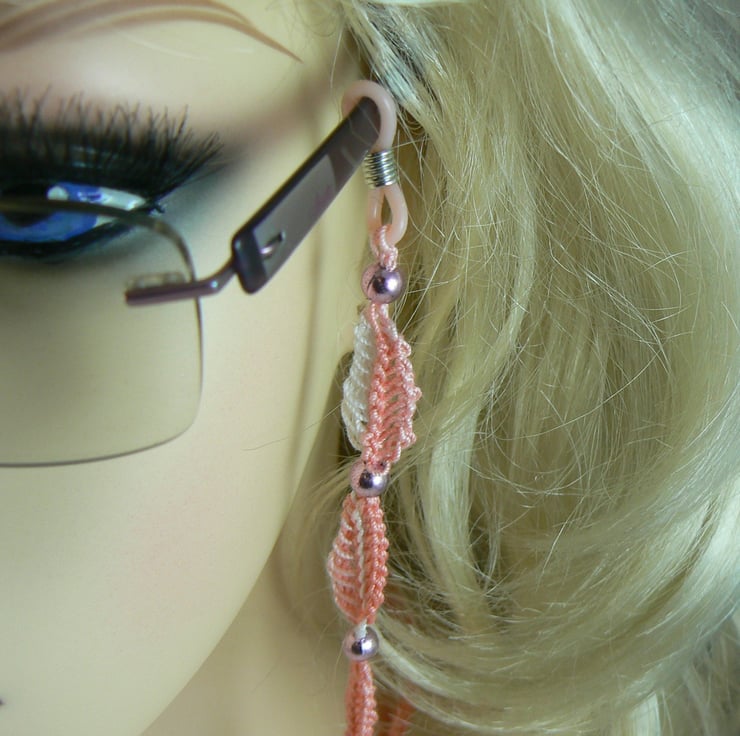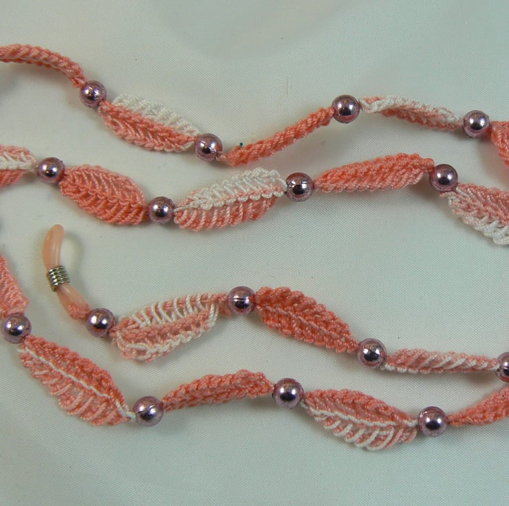 A very useful accessory to have, saves putting reading glasses down and forgetting where you have but them. Just pop the lanyard on the glasses and they will always be at hand round your neck. I have crocheted this glasses lanyard in a leaf pattern design using a peach crochet cotton that is highlighted with white. The leaves are separated by peach metallic beads.