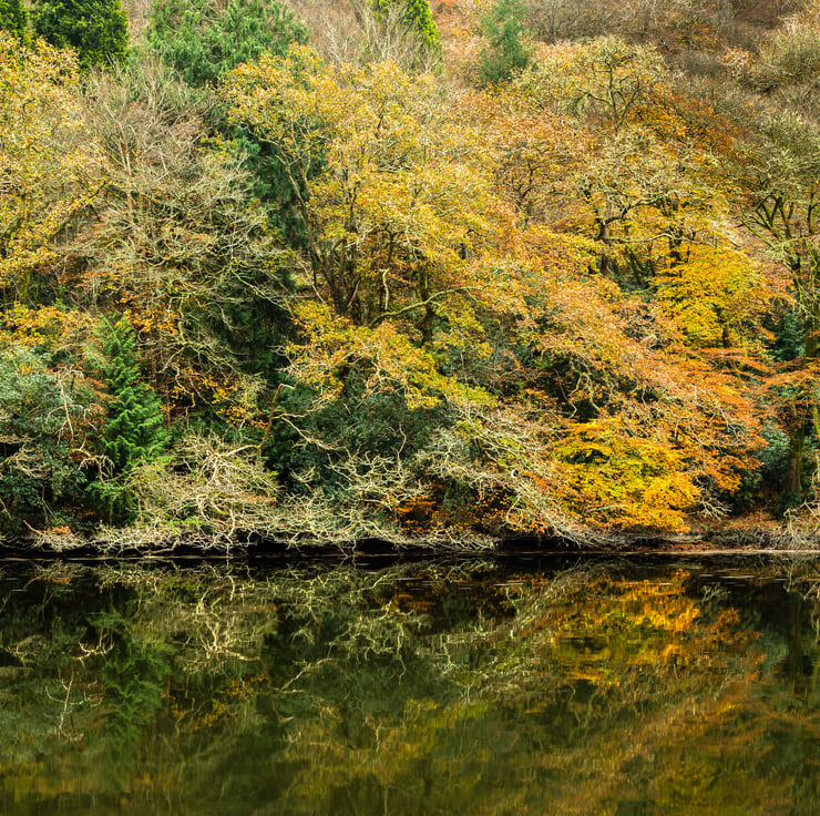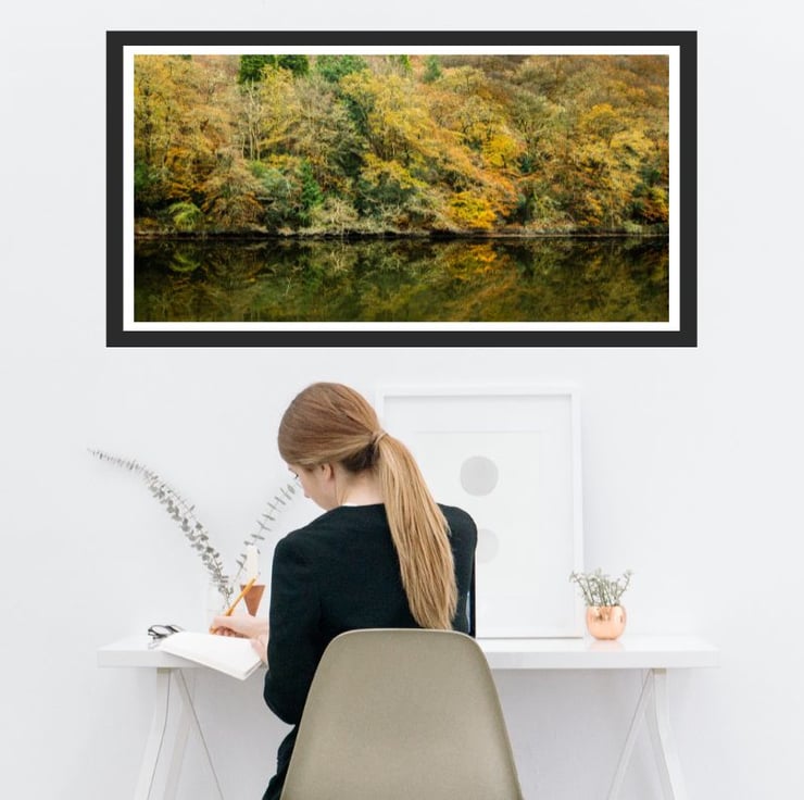Photographic print of the colourful autumn woodland beside the tidal river Lerryn where the reflections from the richly coloured trees were stunning as we walked this beautiful footpath along the Rivers Lerryn and Fowey.