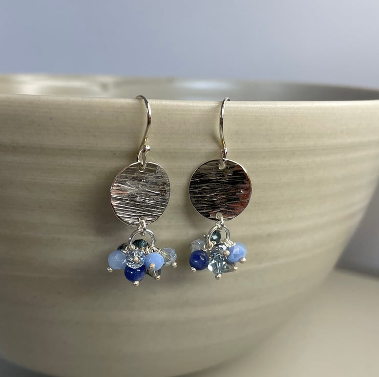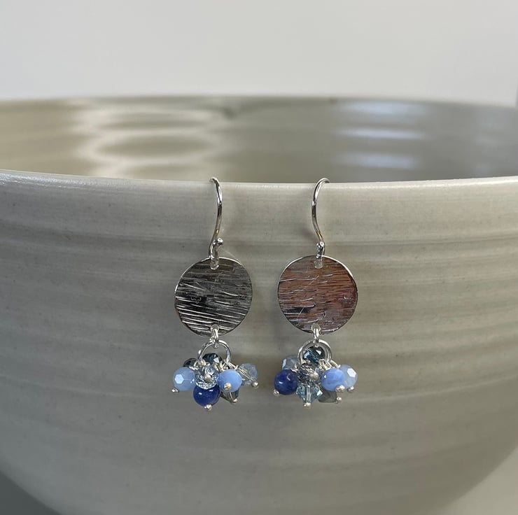 Blue fans, these earrings are for you! Mixing glittering faceted crystal beads with semi precious sodalite beads in shades of light and dark blue, each beads is individually hung on a fine sterling silver pin. The cluster of beads are suspended below a 15mm circle of recycled Sterling silver featuring an organic, hammered bark effect texture. Total length is 40mm including handmade ear wire fitting. Available in different colour ways.
