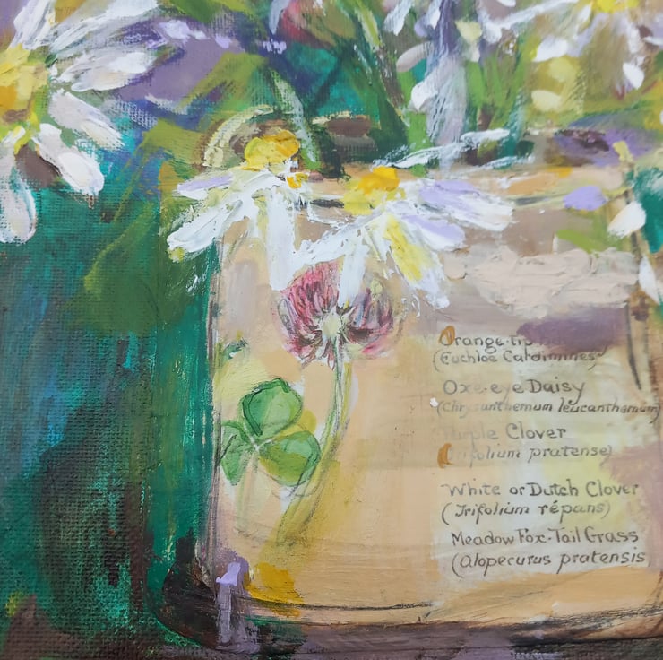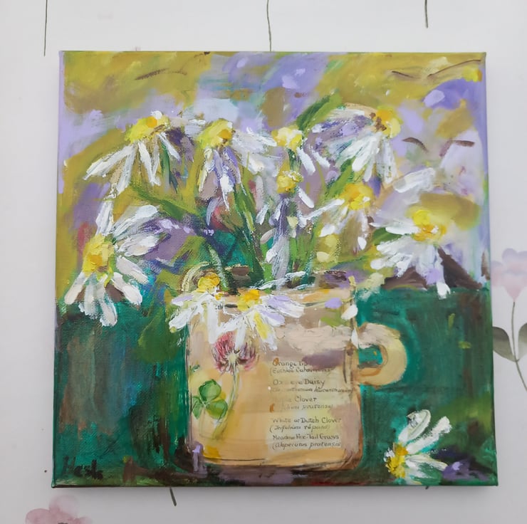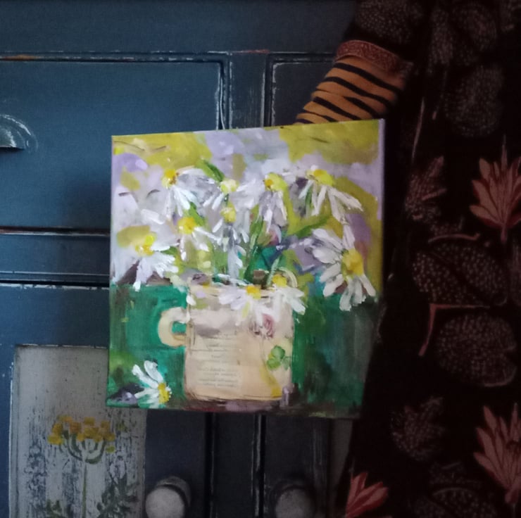 Bright an jolly, these cheerful daisys are in thick acrylic and collage. A 30 cm.square happy painting. In my loose signature style. Hope it brings you joy. Signed, lightly varnished and ready to hang.