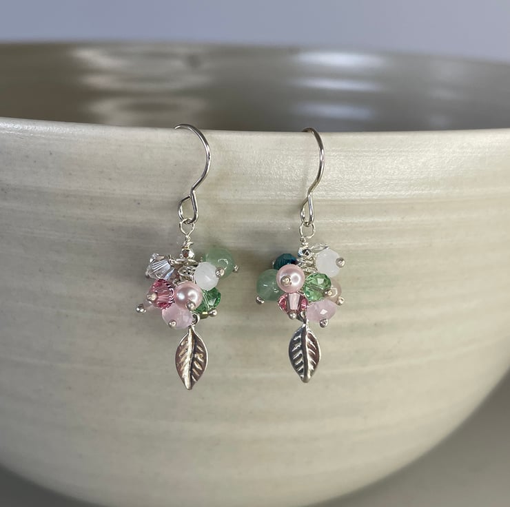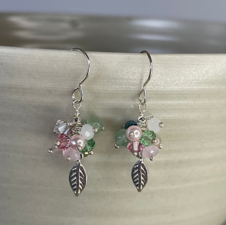 Garden inspired in the colours of Spring, this delicate cluster earrings combines soft pink tones with shades of green. Made from Sterling silver and continues a mixture of faceted crystal beads, glass pearls and semi precious beads, all in various tones and textures. A tiny leaf motif hangs from the end of the earrings and are 35mm long. Co-ordinating necklace and bracelet are available and can be made in other colours.