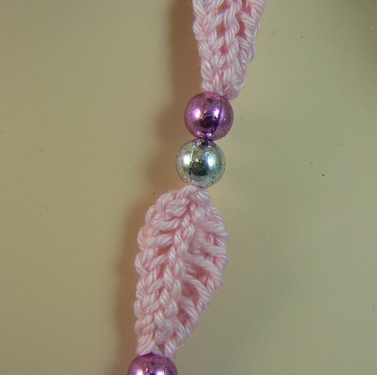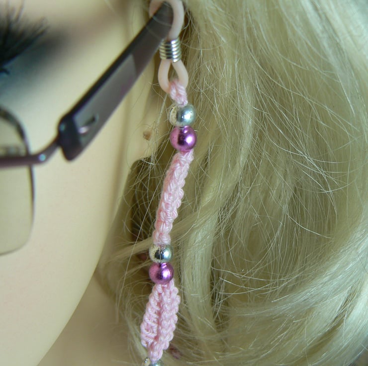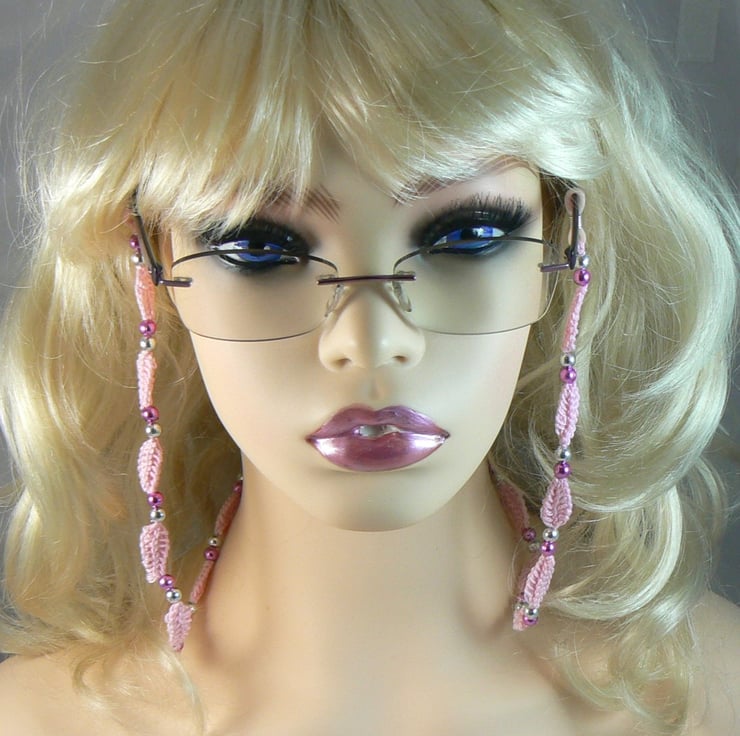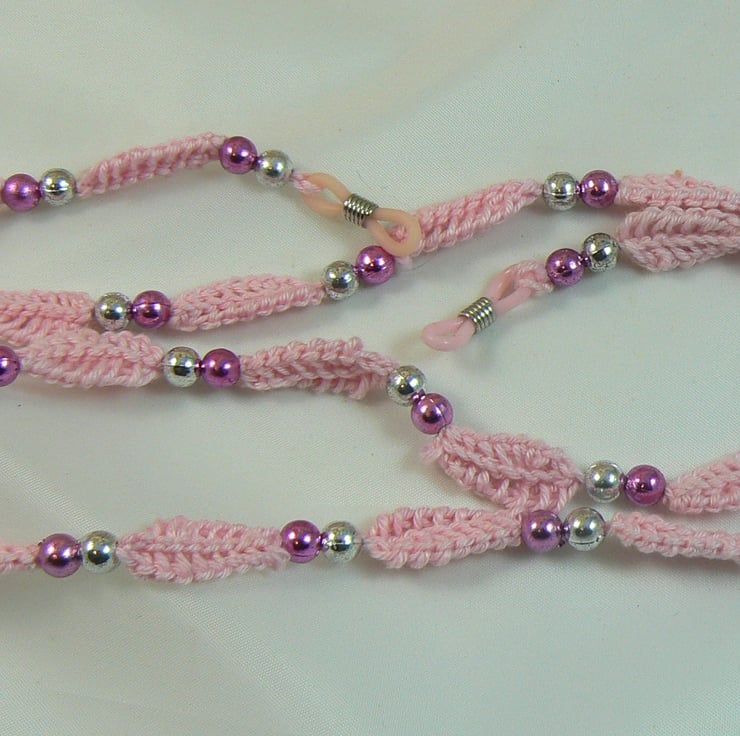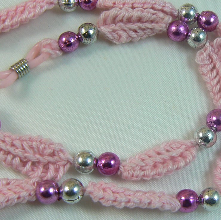 A very useful accessory to have, saves putting glasses down and forgetting where you have put them.. Just pop the lanyard on the glasses and they will be at hand hanging round your neck. I have crocheted this glasses lanyard in a leaf pattern in pastel pink . The leaves are separated by tow metallic beads, one is silver and one cerise.