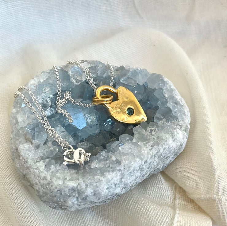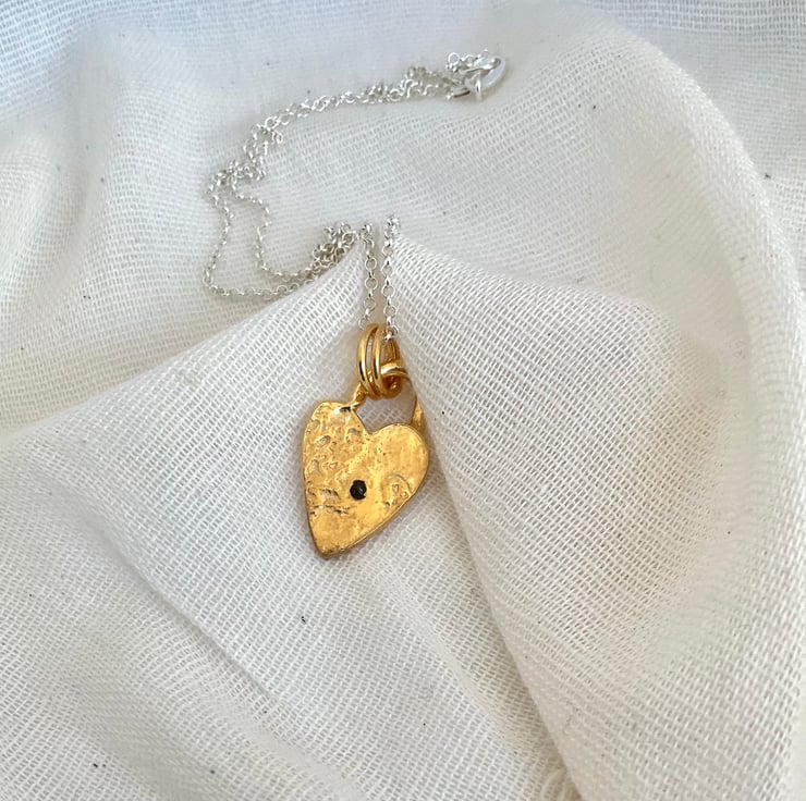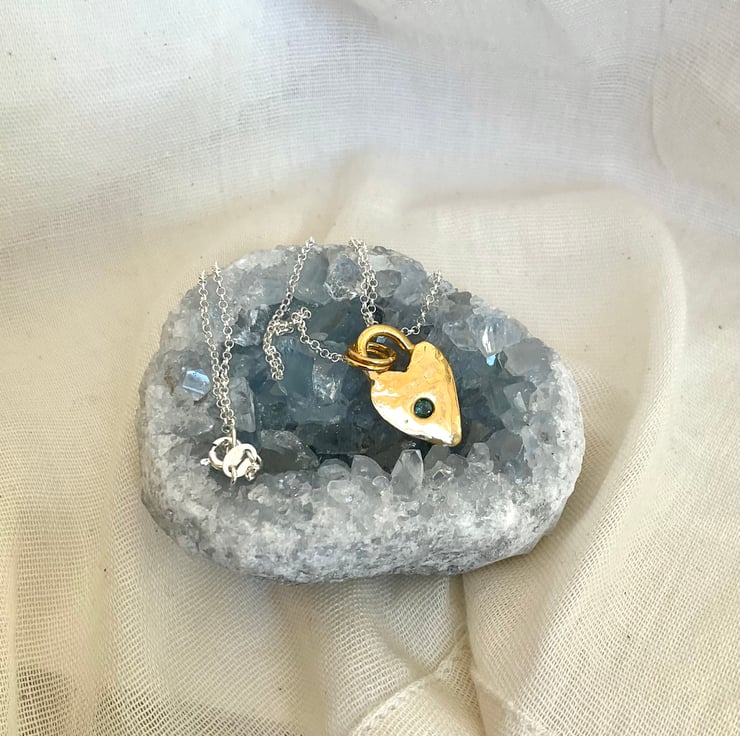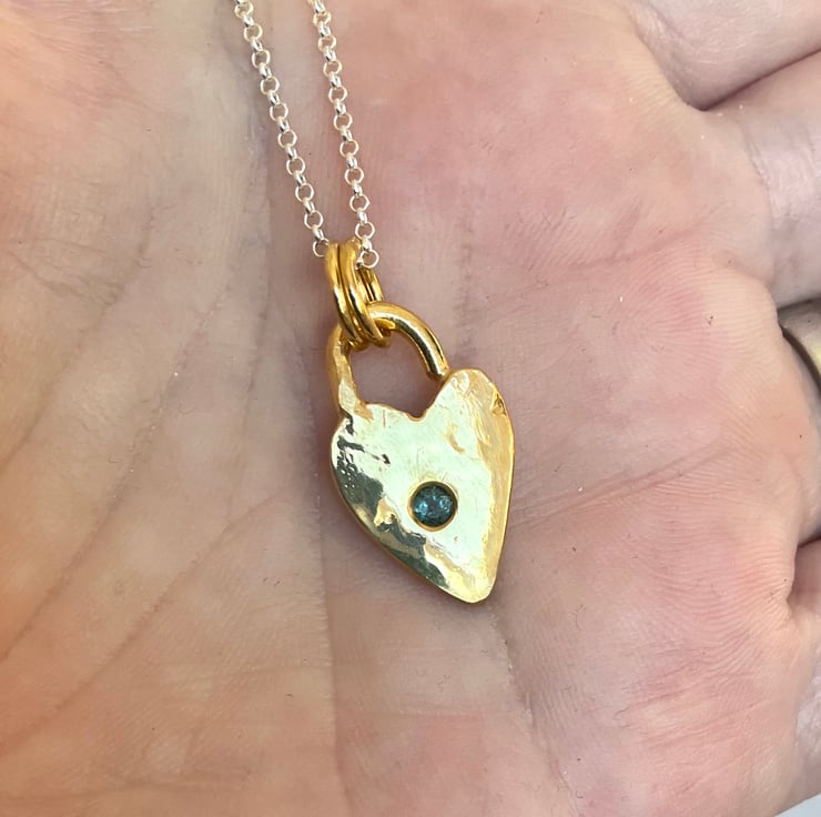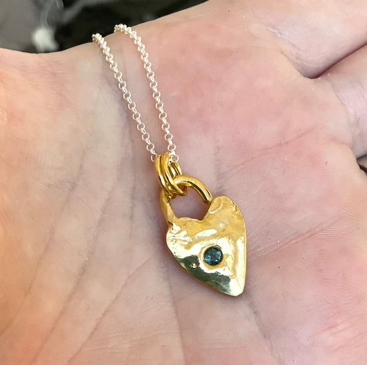 This is an organic form boutique style heart pendant approximately 2x2cm. The heart is made of molten sterling silver then hand cut to create an asymmetrical heart shape and bares the texture created by the molten metal process. The heart has a teal blue faceted Tourmaline gemstone set in it and the piece has a quality 3 micron layer of 18 karat gold. The piece hangs on a delicate 18” sterling silver belcher chain.