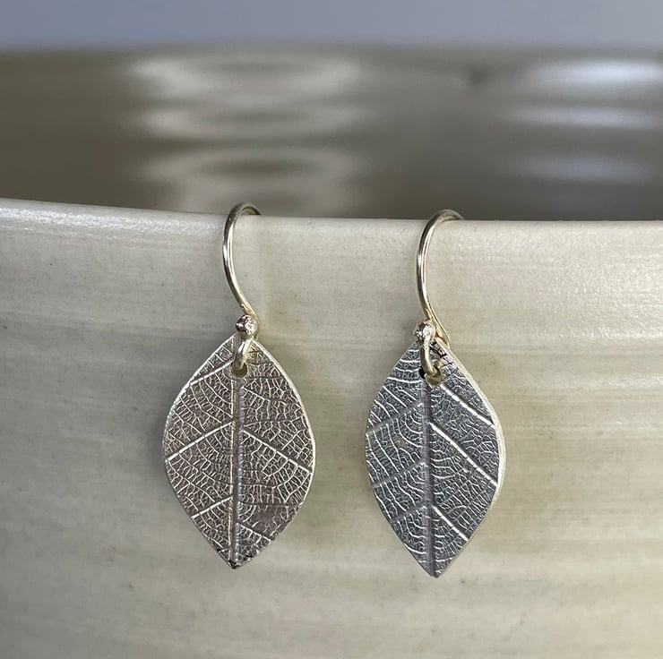 Using a technique of transferring leaf texture impressed onto recycled Sterling silver, these earrings have been carefully handmade to enhance the vain pattern and design of the leaf structure. Cut into a leaf shape and hung from handmade ear wires, they hang 30mm long.