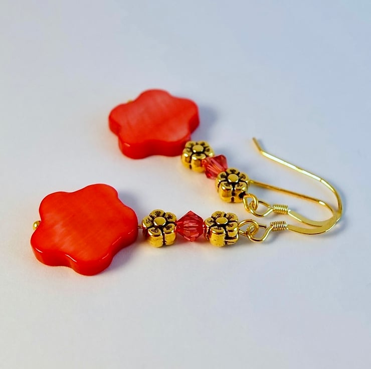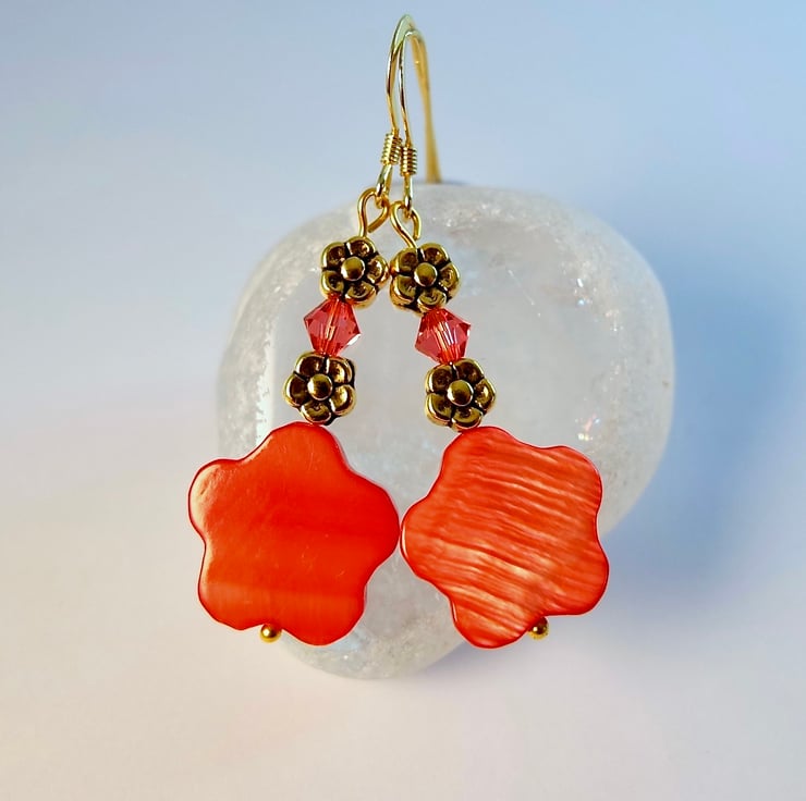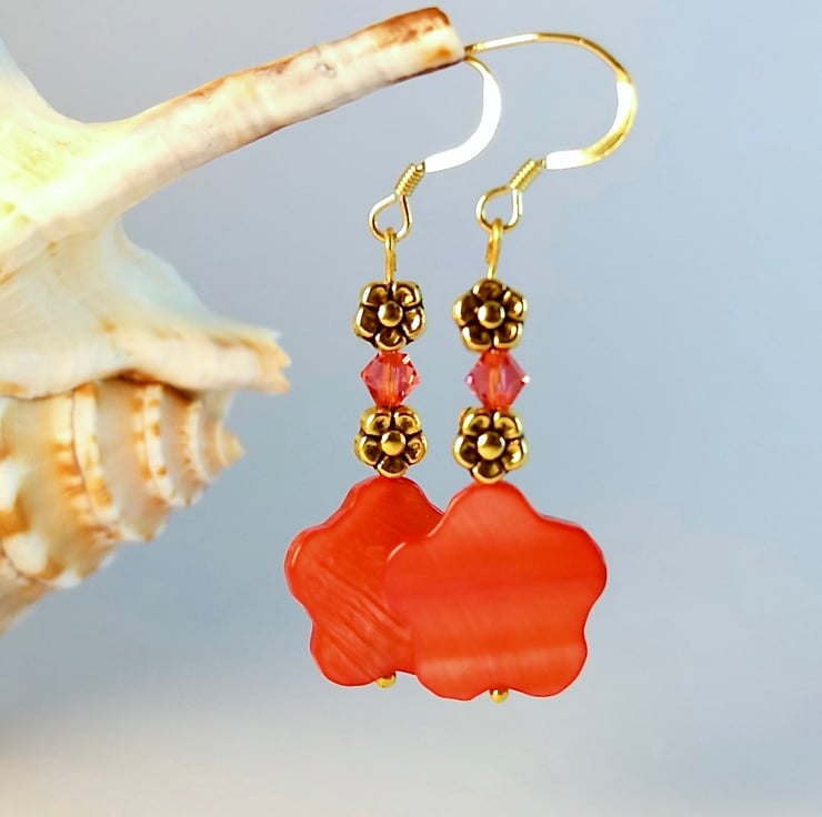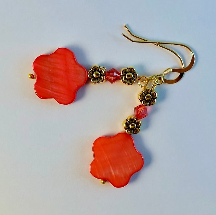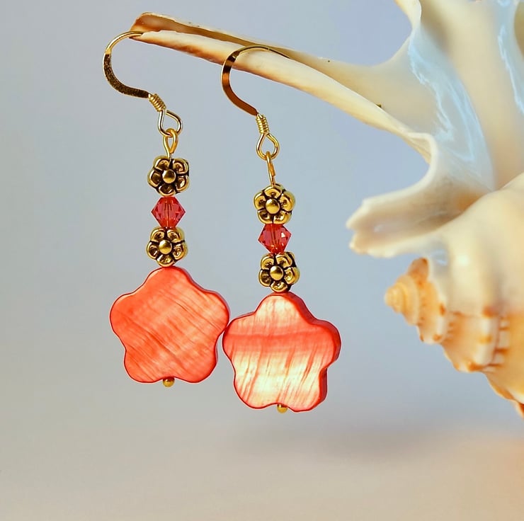 The Mother of Pearl flowers are a deep salmon pink with a beautiful sheen, and these earrings are very lightweight and easy to wear.