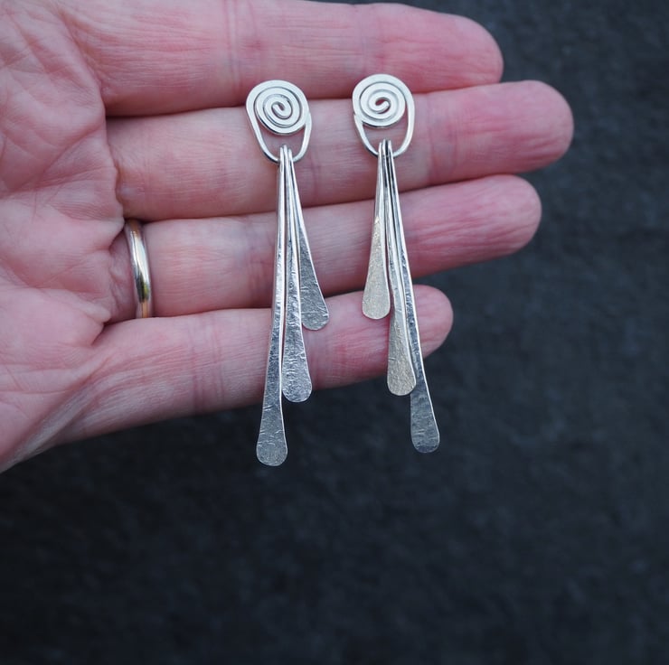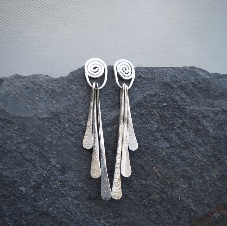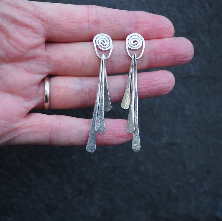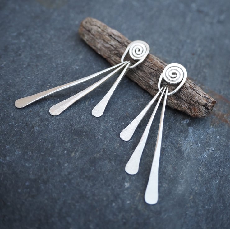 These handmade earrings feature 3 forged silver rods of varying lengths that hang beneath a spiral stud earring.