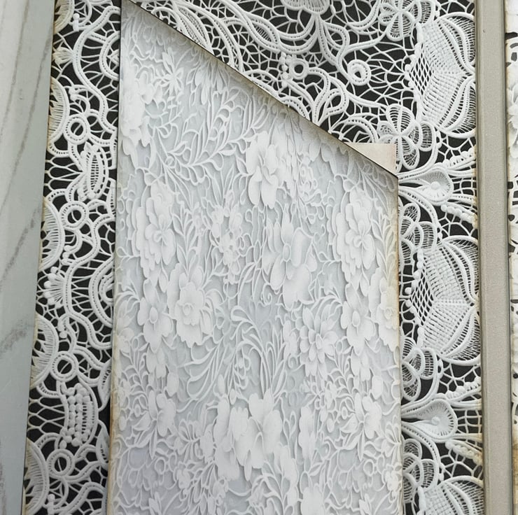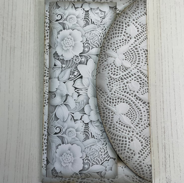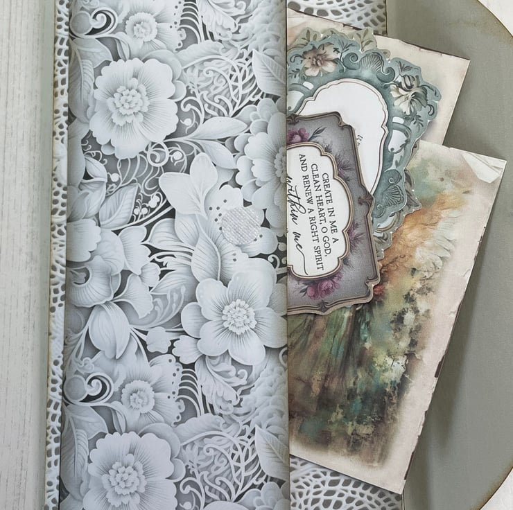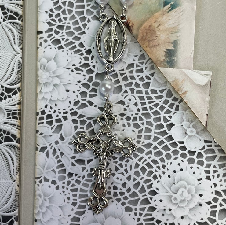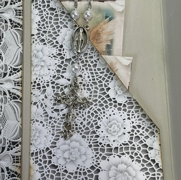 White lace print makes this a light and pretty faith folio with pockets and assorted faith cards. Closure either hook and loop dot. Pearl and silver bead decade rosary, our lady charm with a detailed crucifix.