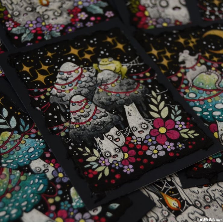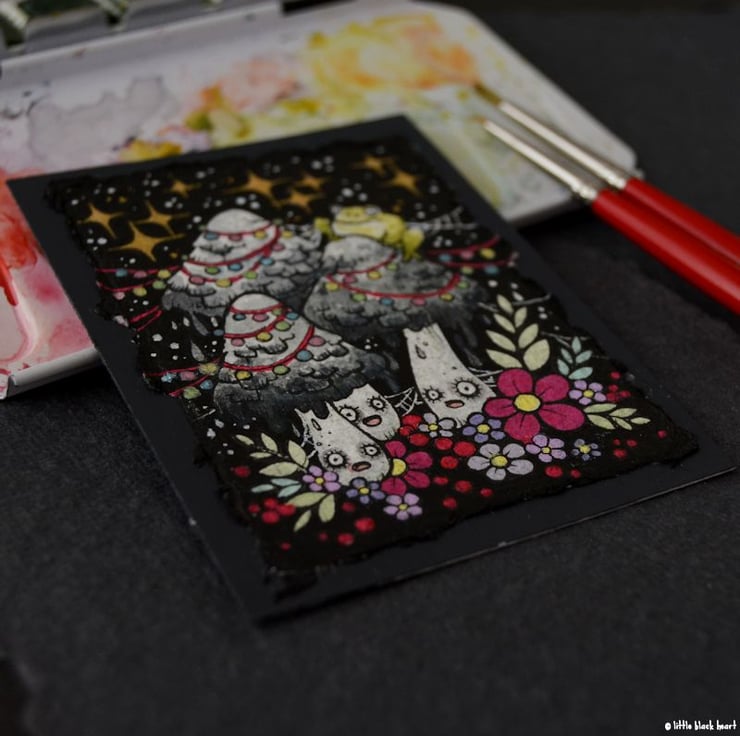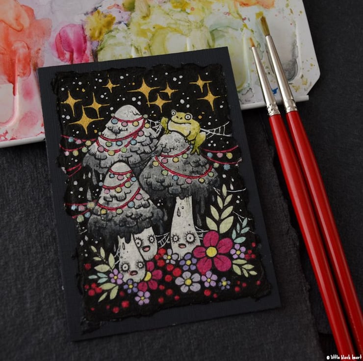 this aceo is an original artwork, hand drawn with a tiny 0.05 nibbed pen, then coloured with ink, artists pens and watercolour paints, on indian khadi paper. khadi paper is handmade from recycled cotton rag, it has a lovely textured surface and deckled edges. i have then mounted the illustration onto 300gsm cardstock, hand painted with a paynes grey to create a dark surrounding edge/background.