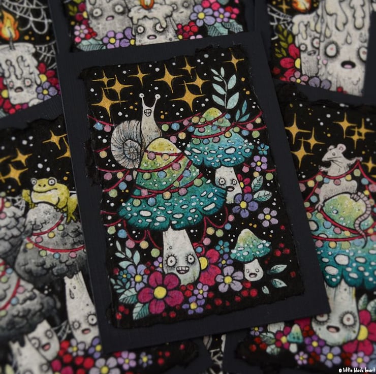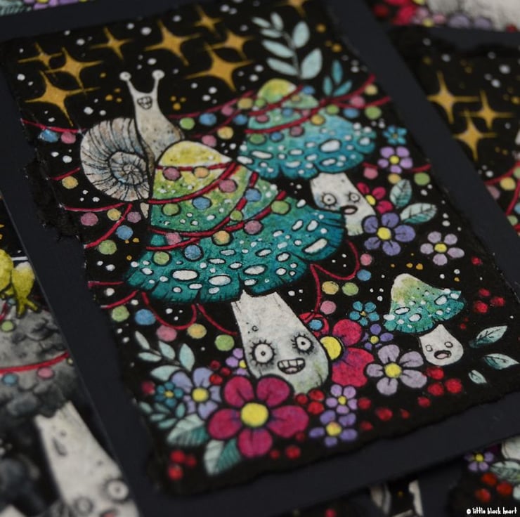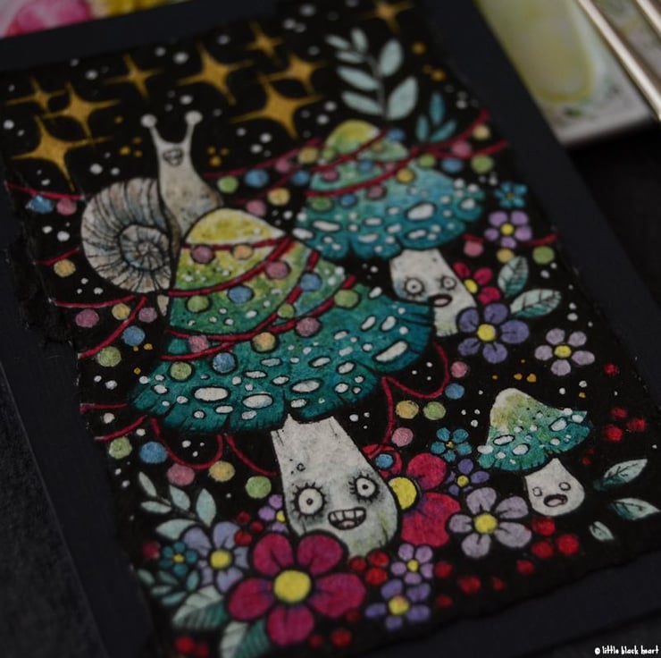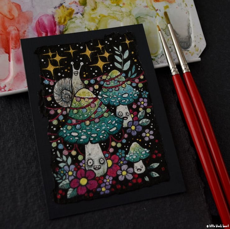 this aceo is an original artwork, hand drawn with a tiny 0.05 nibbed pen, then coloured with ink, artists pens and watercolour paints, on indian khadi paper. khadi paper is handmade from recycled cotton rag, it has a lovely textured surface and deckled edges. i have then mounted the illustration onto 300gsm cardstock, hand painted with a paynes grey to create a dark surrounding edge/background.