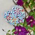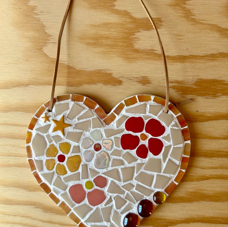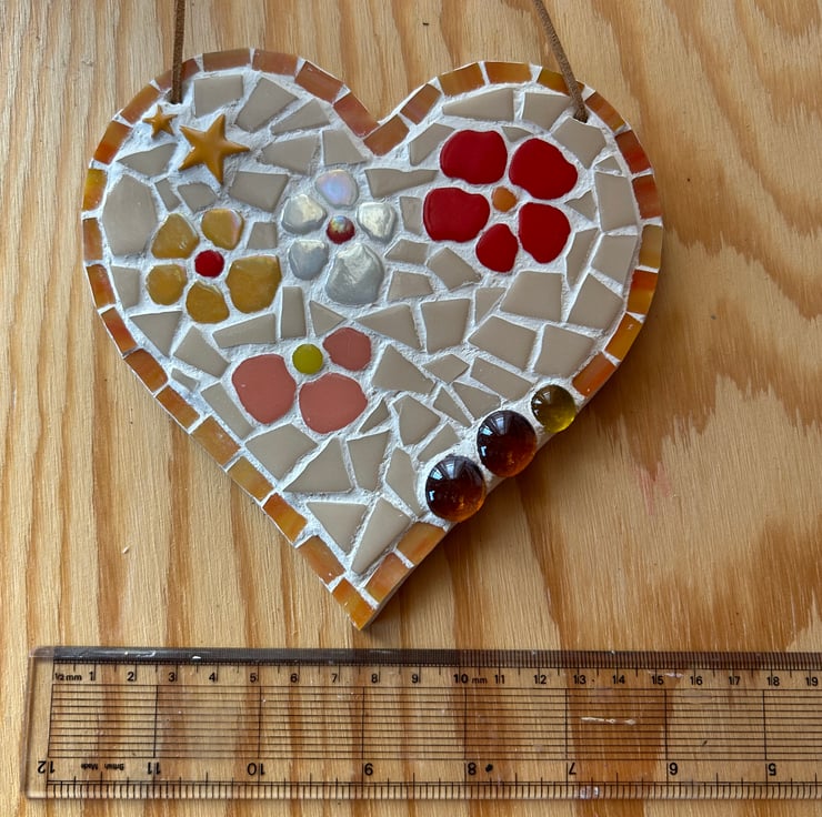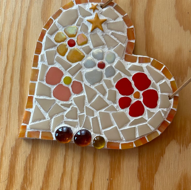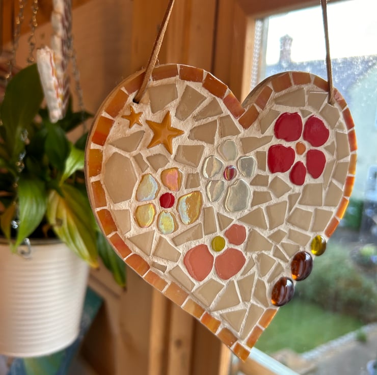 A ceramic and glass mosaic heart on a wooden background, with a cream background and orange highlights, made to brighten any wall or shelf. Some of the mosaic tiles are slightly iridescent, which subtly highlight the floral design. The heart is approximately 15cm wide and has two hanging holes which are strung with a leather thread. Only suitable for indoor use. All items are original, unique and handmade by me.