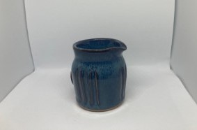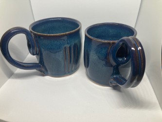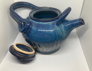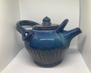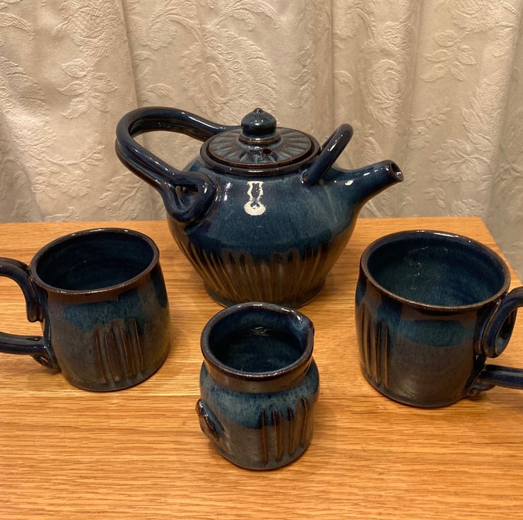 I've been developing my teapot design for 18 months, working on size, handles, lid design and pouring quality. The handles are positioned so that the teapot is lifted and tilted to pour from its centre of gravity. The pour is smooth and non-drippy. The lid is carved to a fancy knob because I like doing them like that! This blue glaze is a favourite. The mugs echo the teapot design with loopy handles. Each item is finished with my pansy motif.