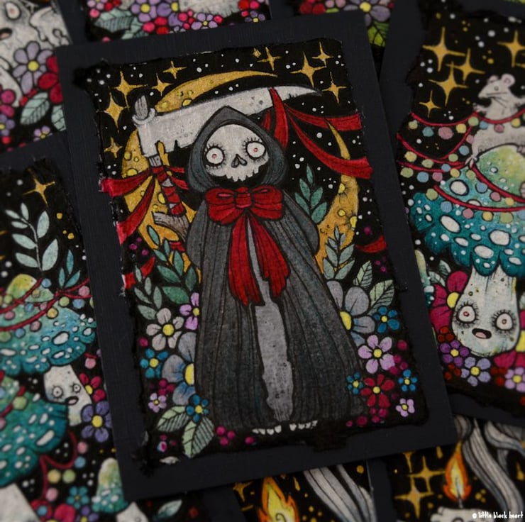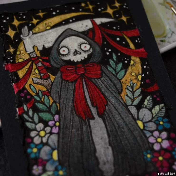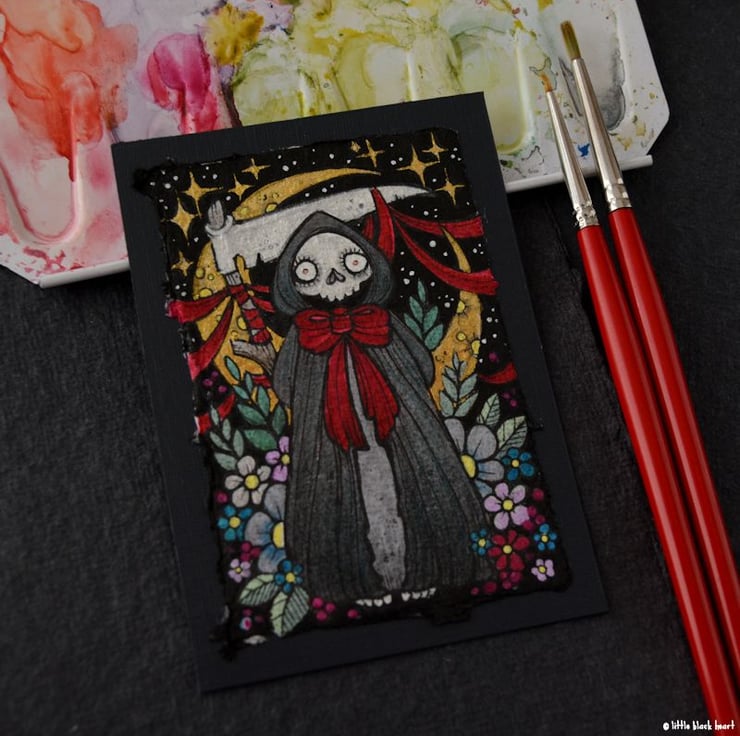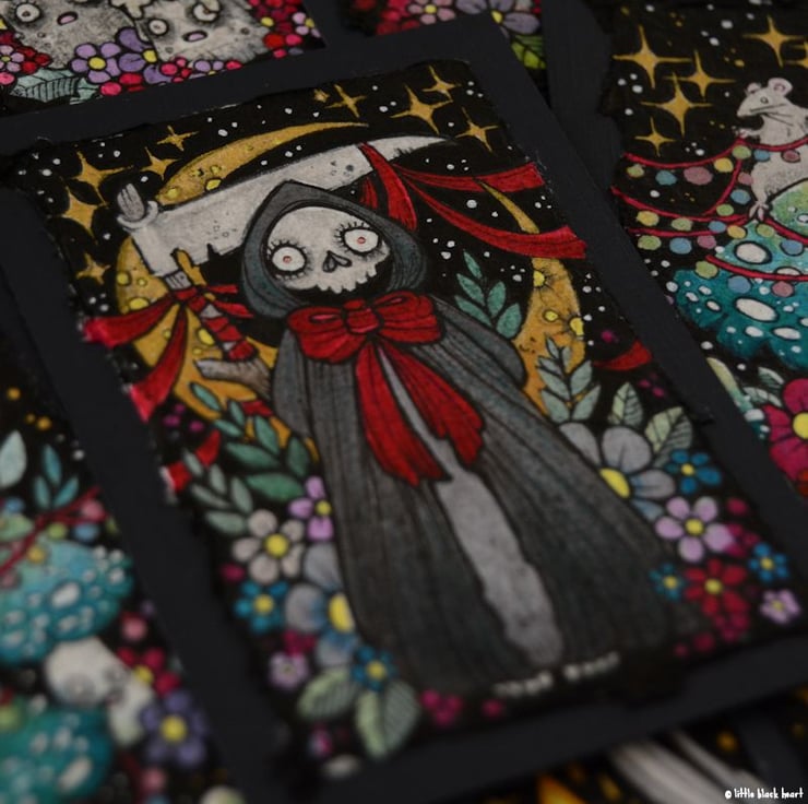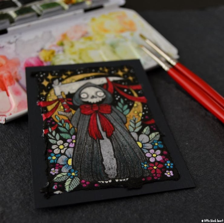 this aceo is an original artwork, hand drawn with a tiny 0.05 nibbed pen, then coloured with ink, artists pens and watercolour paints, on indian khadi paper. khadi paper is handmade from recycled cotton rag, it has a lovely textured surface and deckled edges. i have then mounted the illustration onto 300gsm cardstock, hand painted with a paynes grey to create a dark surrounding edge/background.