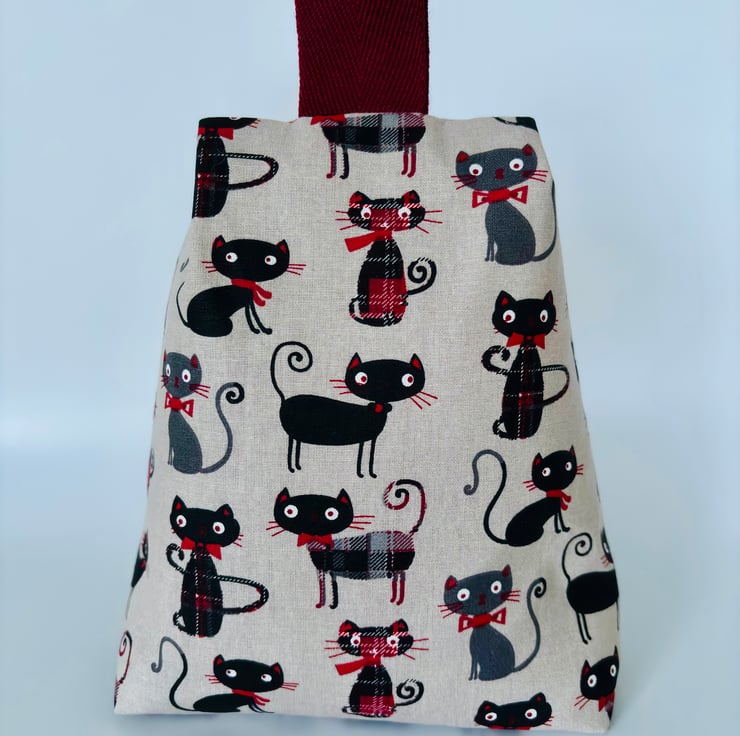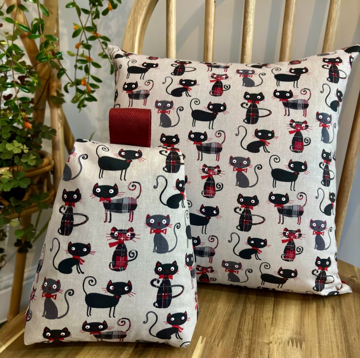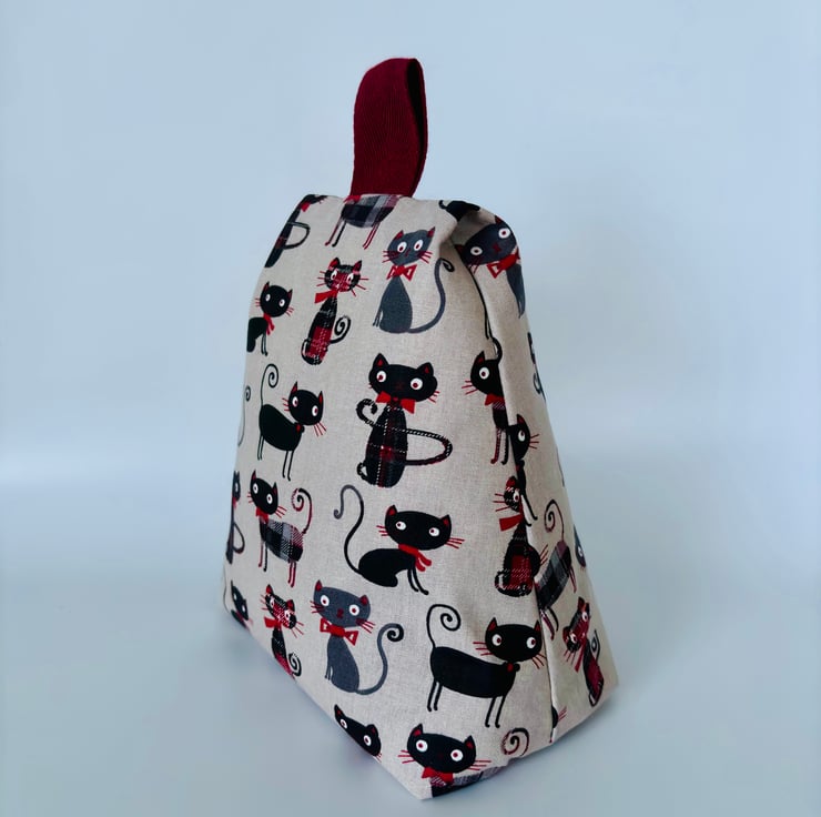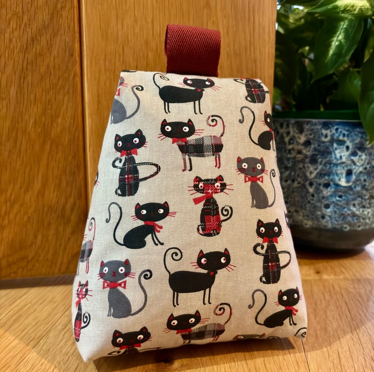 Handmade cotton fabric doorstop made with a fun print of stylish cats, in red, grey, black and tartan.