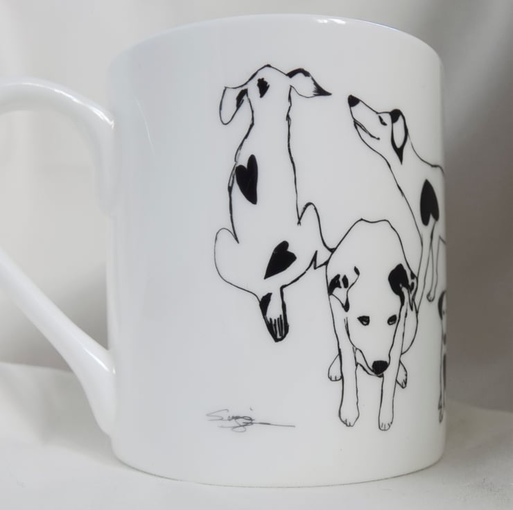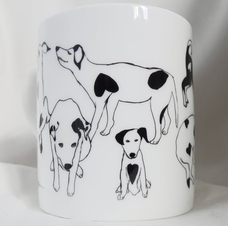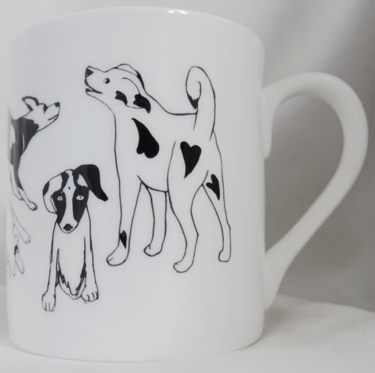 This mug was inspired by the ink drawings I was making of my own black and white dog Snowy. Everyone loves dogs and we all know that dogs love us ... so here are dogs scampering, running, sitting and playing, all wearing their hearts on their furry sleeves!