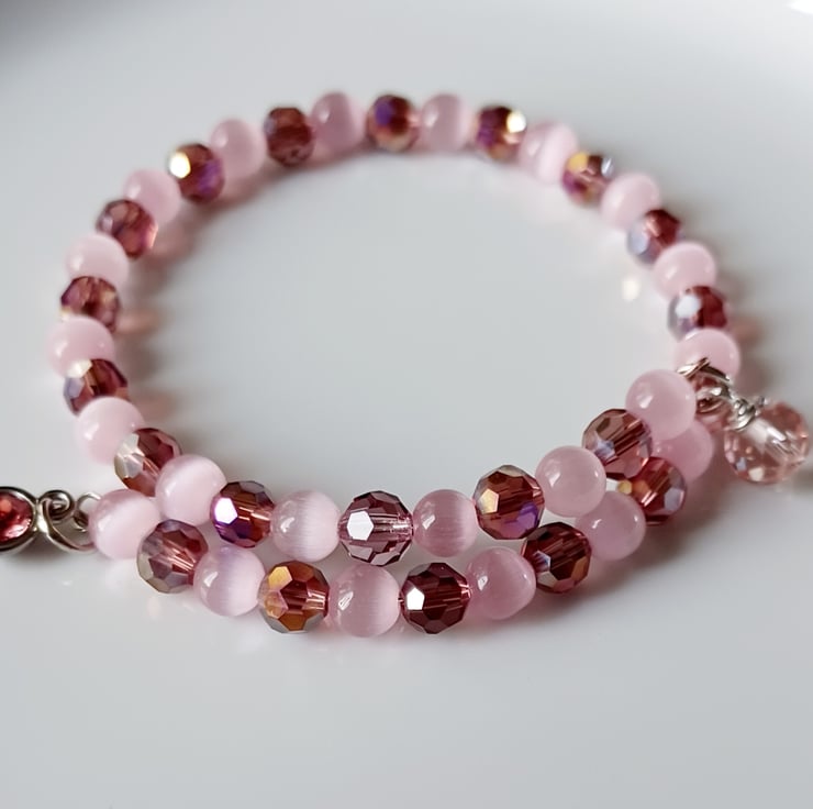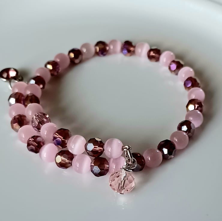 Pretty pink Cat's Eye and Czech purple bead memory wire wrap bracelet with pink rhinestone cameo charm and dangly pink crystal.