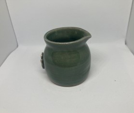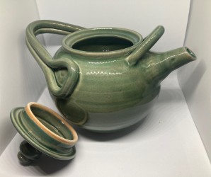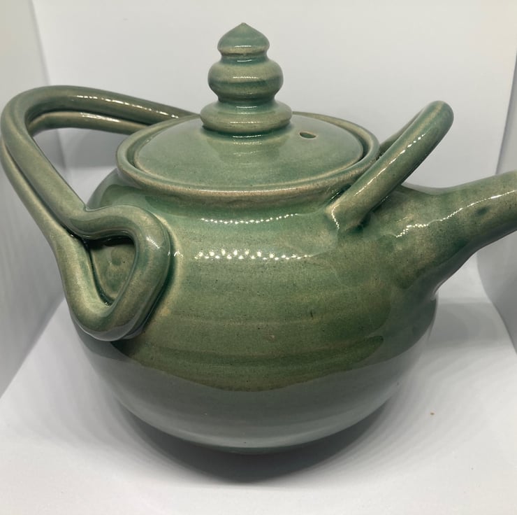 I've been developing my teapot design for 18 months, working on size, handles, lid design and pouring quality. The handles are positioned so that the teapot is lifted and tilted to pour from its centre of gravity. The pour is smooth and non-drippy. The lid is carved to a fancy knob because I like doing them like that! This pretty evergreen glaze is cosy and fresh. The mugs echo the teapot design with loopy handles. Each item is finished with my pansy motif.