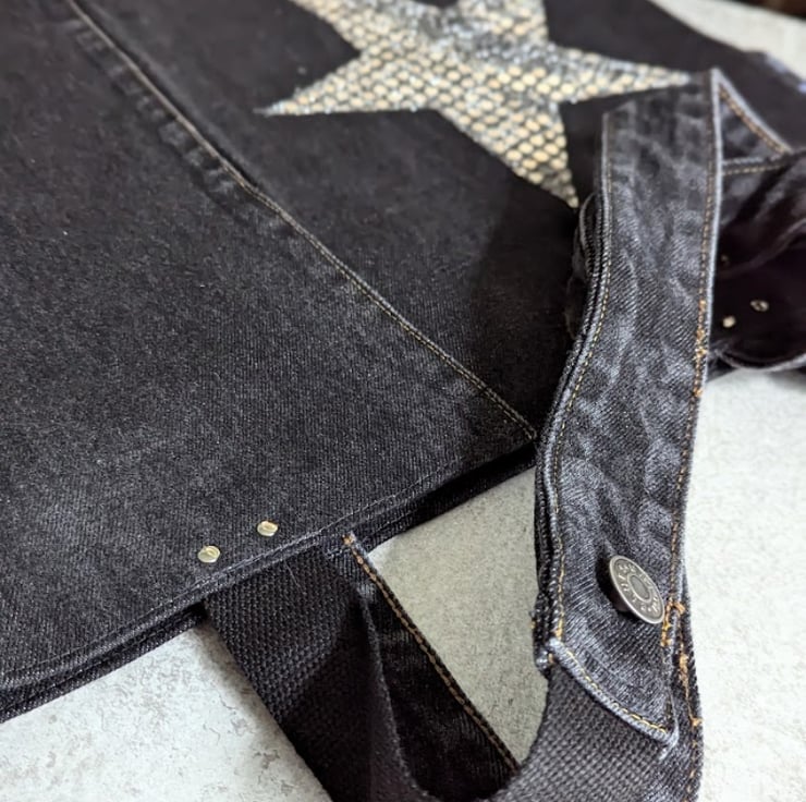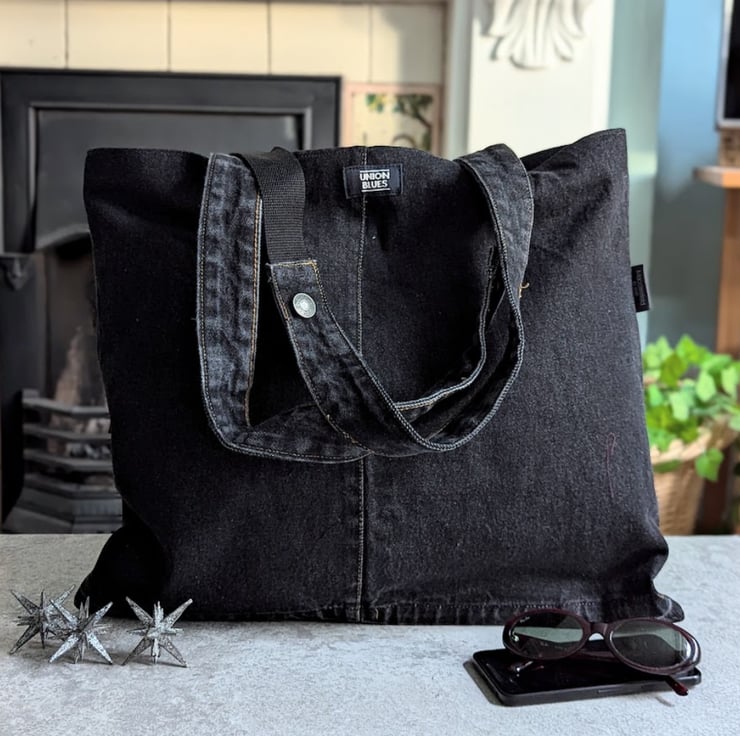 Handmade from sturdy black preloved denim, this roomy tote is great as an everyday bag with a bit of added sparkle.