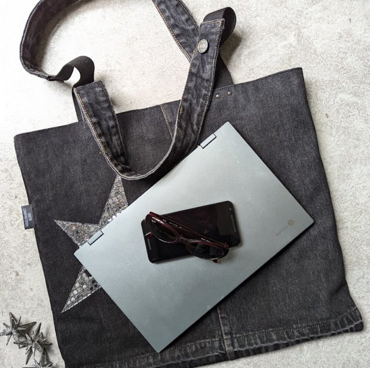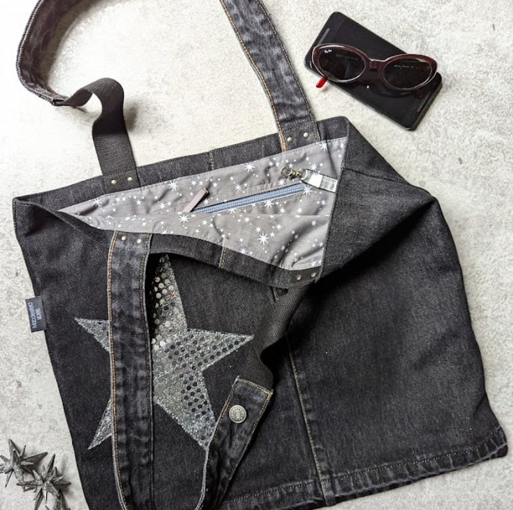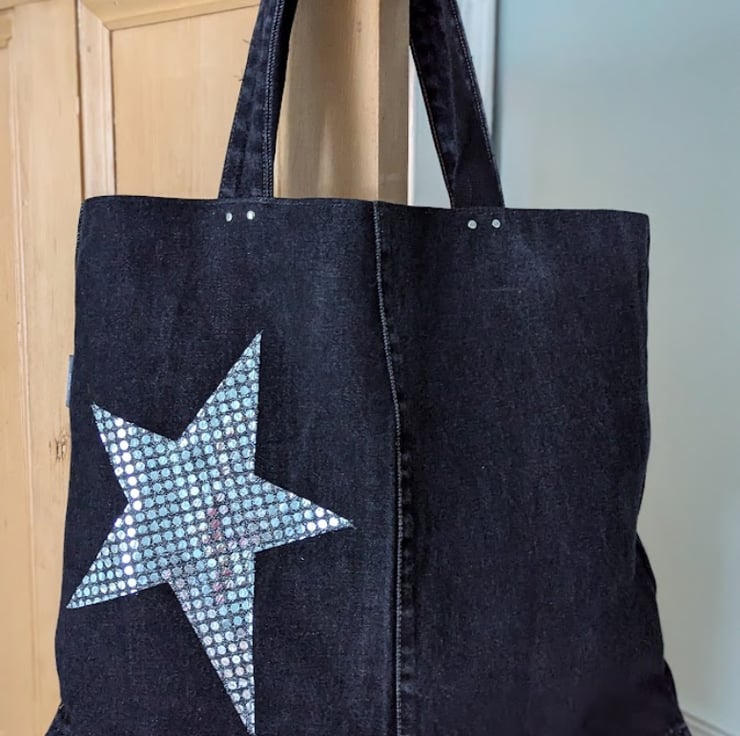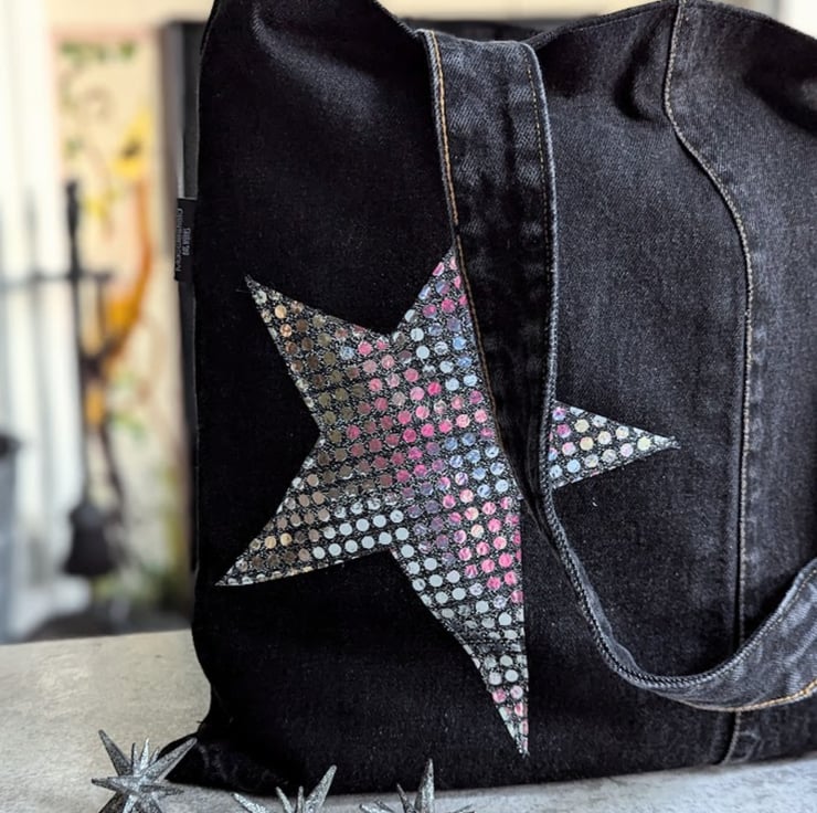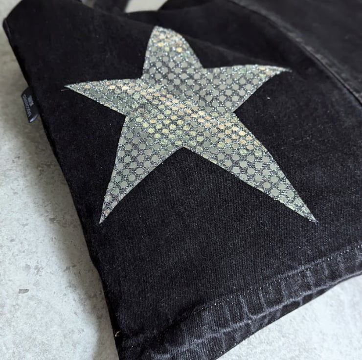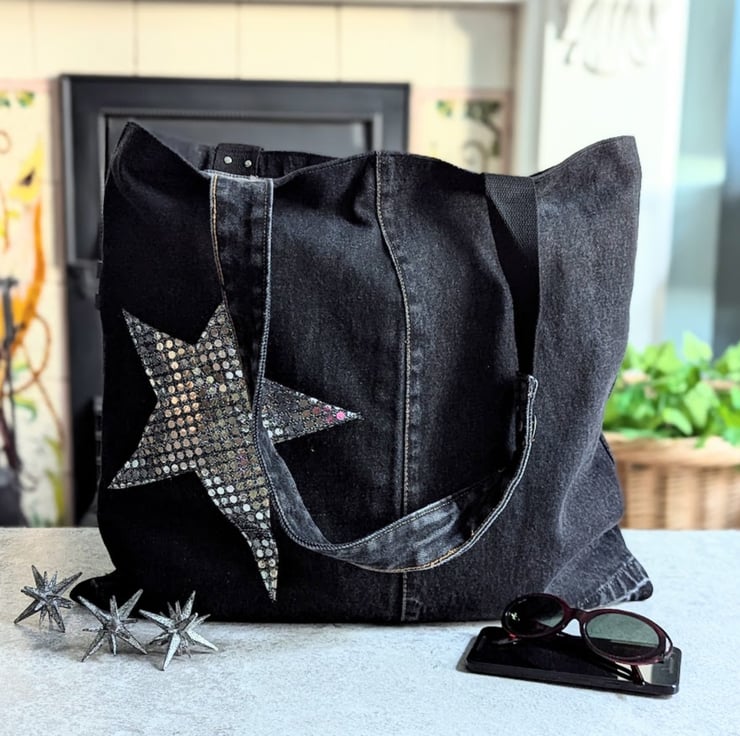 Fabulously large and roomy upcycled black denim tote bag with a faux sequin silver star.