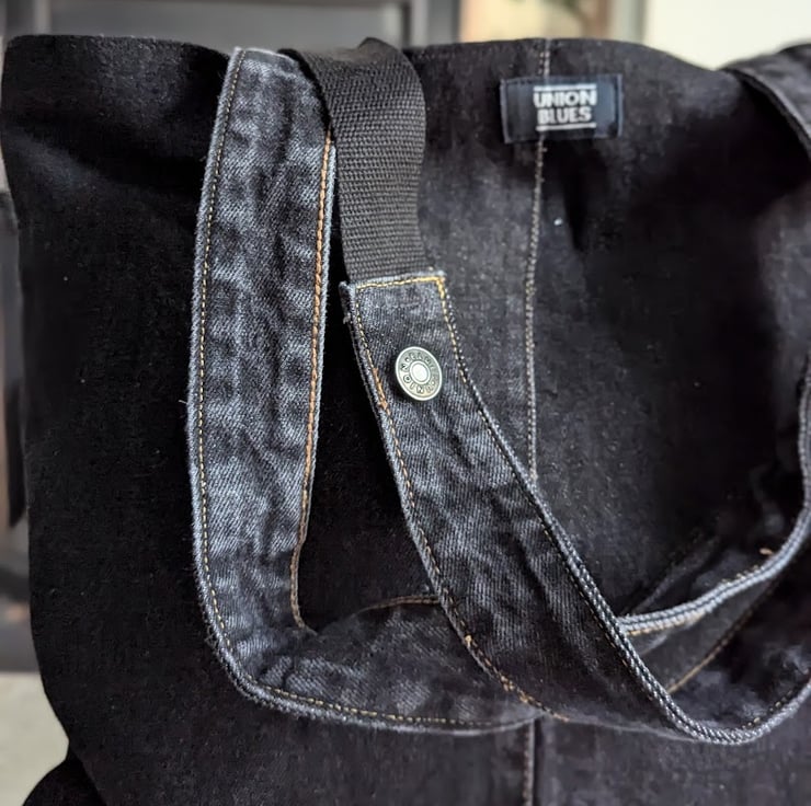 Two shoulder handles are made from the jeans waistband and 38mm wide black webbing have been securely stitched and riveted into place!