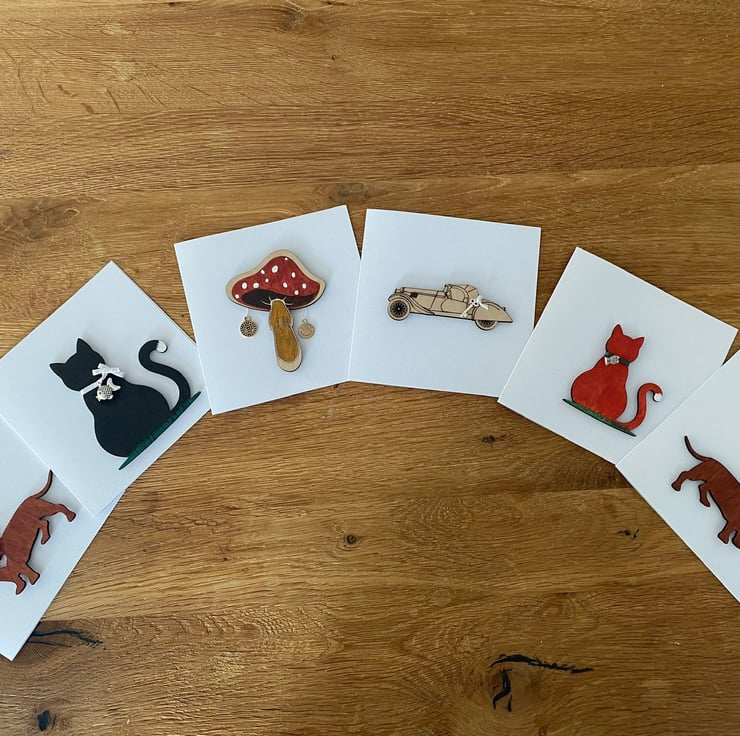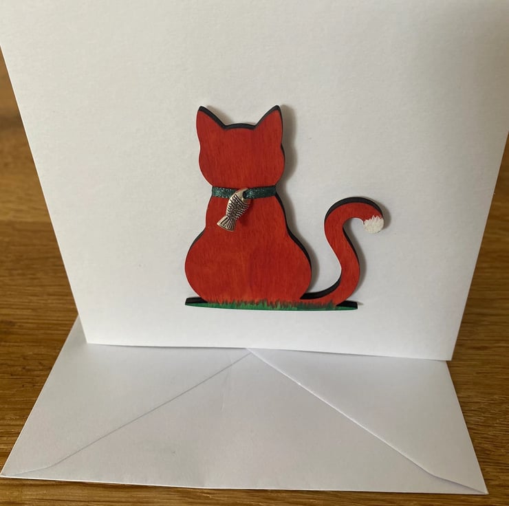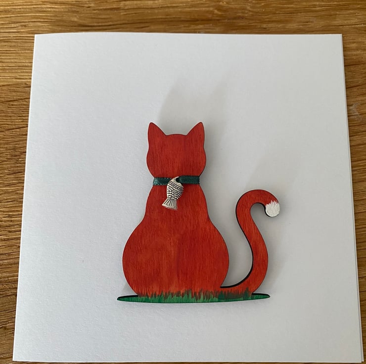 The cat is made from plywood & attached to the card. It is painted ginger & wears a green ribbon collar with a silver coloured fish charm on.