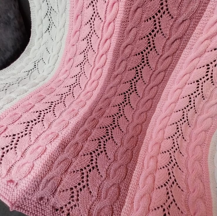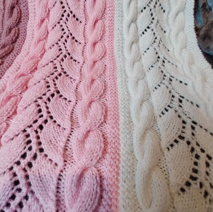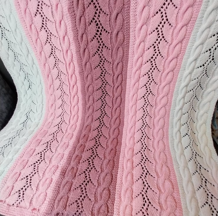 This hand knitted baby blanket is full of softness and warmth, making it a lovely gift for a new baby. Knitted in gentle shades of pink and white, it features a mix of cable and lace panels that create a timeless and elegant look.