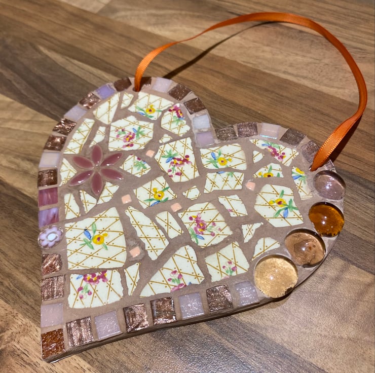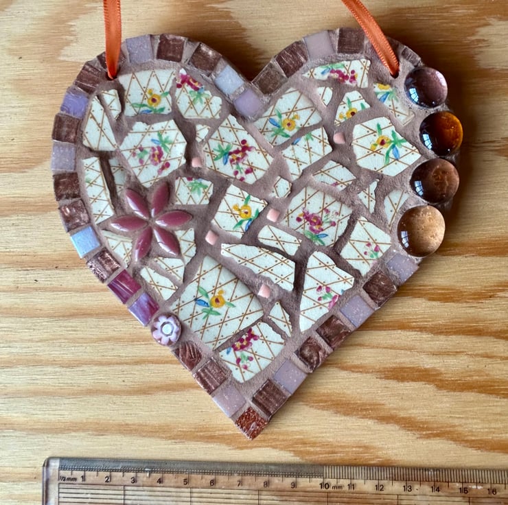 A pretty picassiette mosaic heart which would look great hung on a wall or placed on a shelf in your home. It is approximately 15cm high and 15cm wide and is made from pretty, floral, ceramic plate pieces, complementary ceramic and glass tiles and glass nuggets on a plywood heart and fixed with terracotta grout. This gives it a lovely vintage look. All pieces are original, unique and handmade by me.