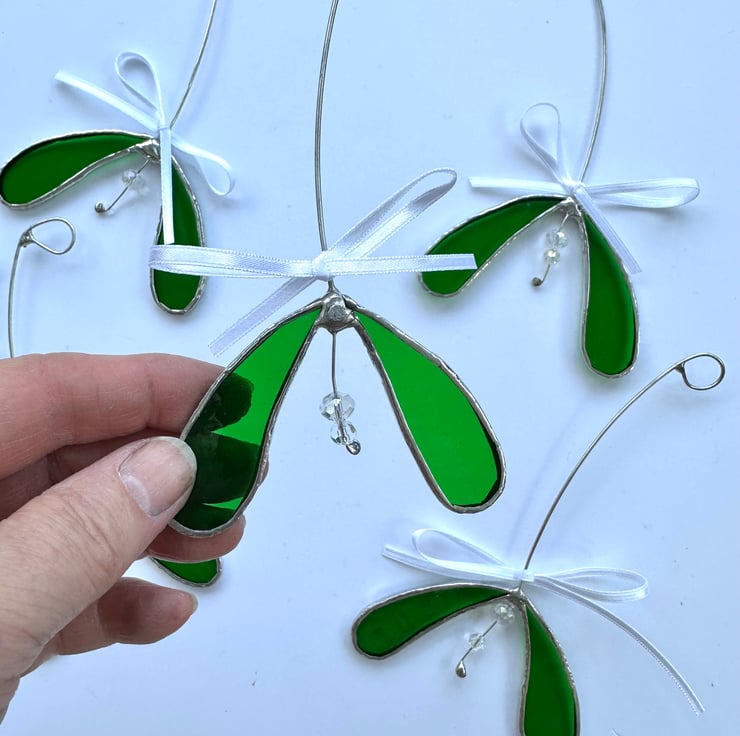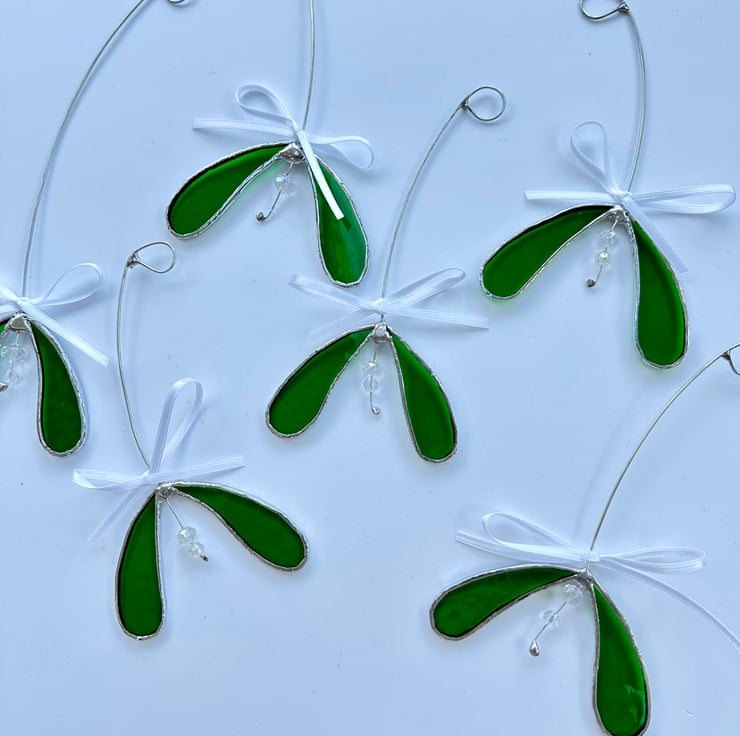 The glass part of each mistletoe measures 6cms x 6 cms. I have added a small white bow to each sprig. Tinned wire has been used to form the stem and hanging ring.