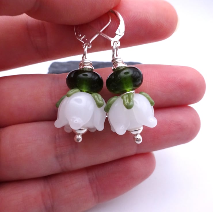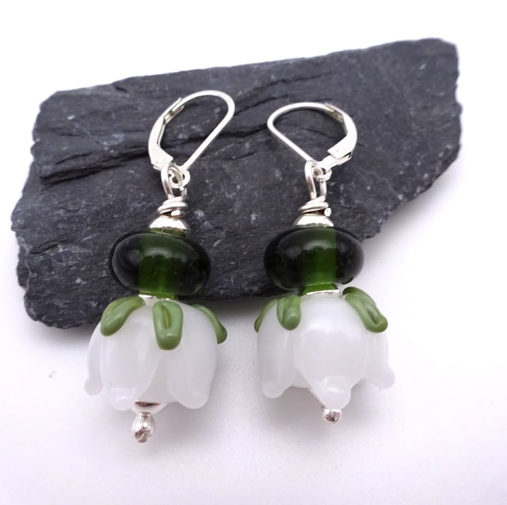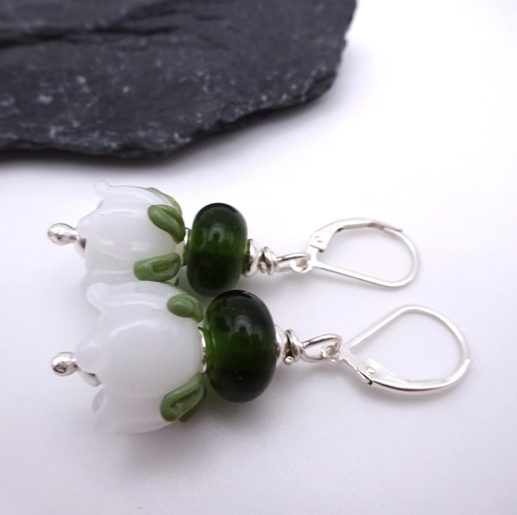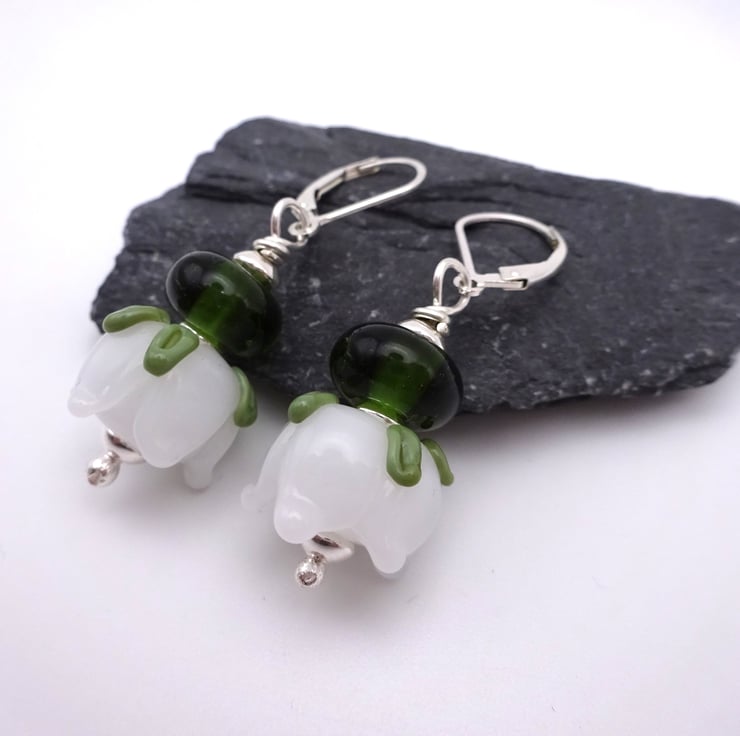 A pair of sterling silver lever back earrings strung with handmade lampwork glass white rose beads.